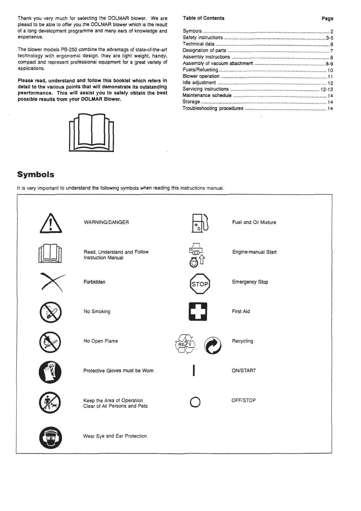 Dolmar PB-250 - Table of Contents; Symbols
