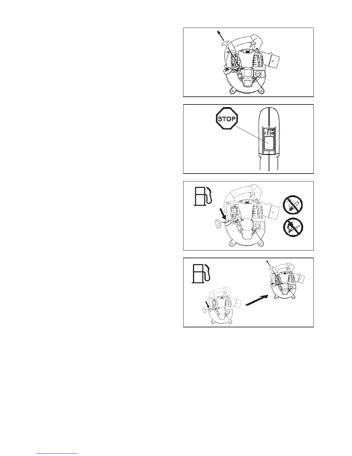 • Never refuel in closed rooms. Fuel vapors accumulate at ground level