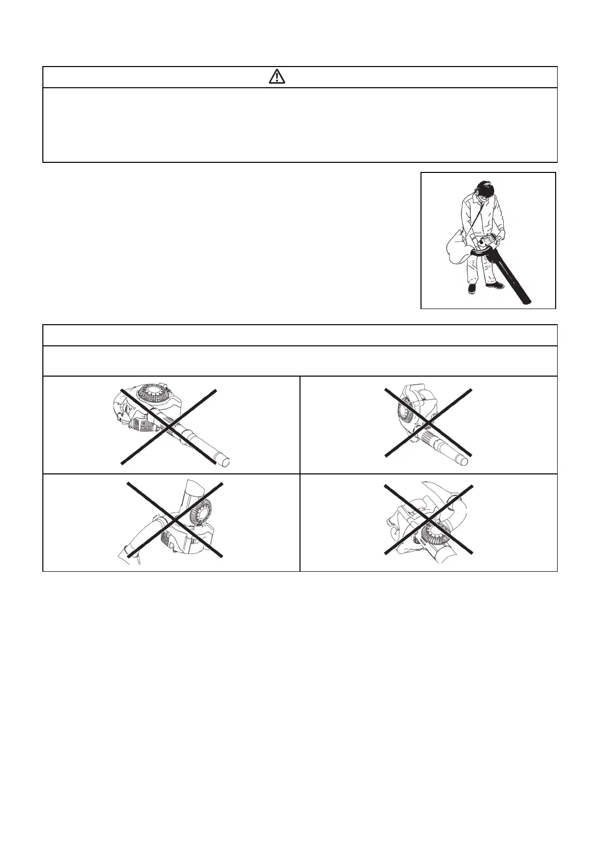 • Do not allow foreign materials, such as large wood chips, metals, glass, pebbles, etc., to be sucked into the machine.