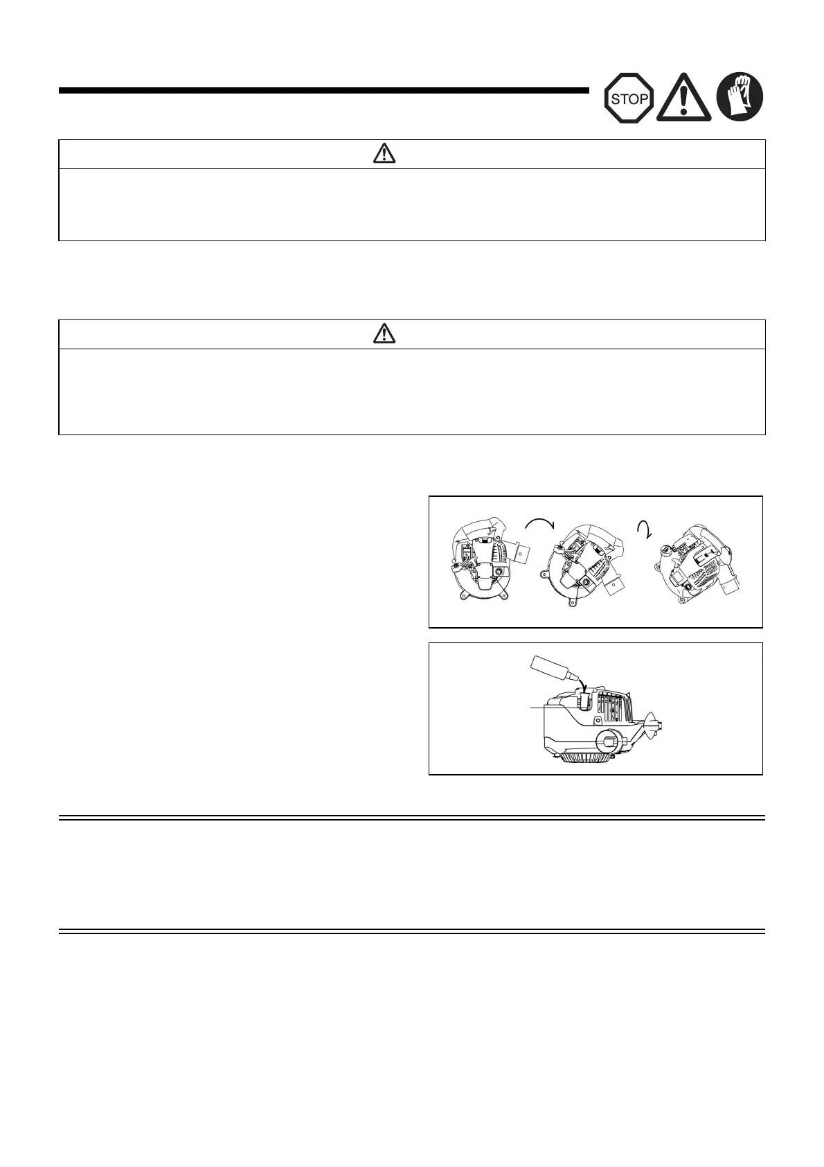 - Als u inspectie of onderhoud uitvoert direct nadat de motor gestopt is of wanneer de bougiekap nog op zijn plaats zit, kunt u zich branden