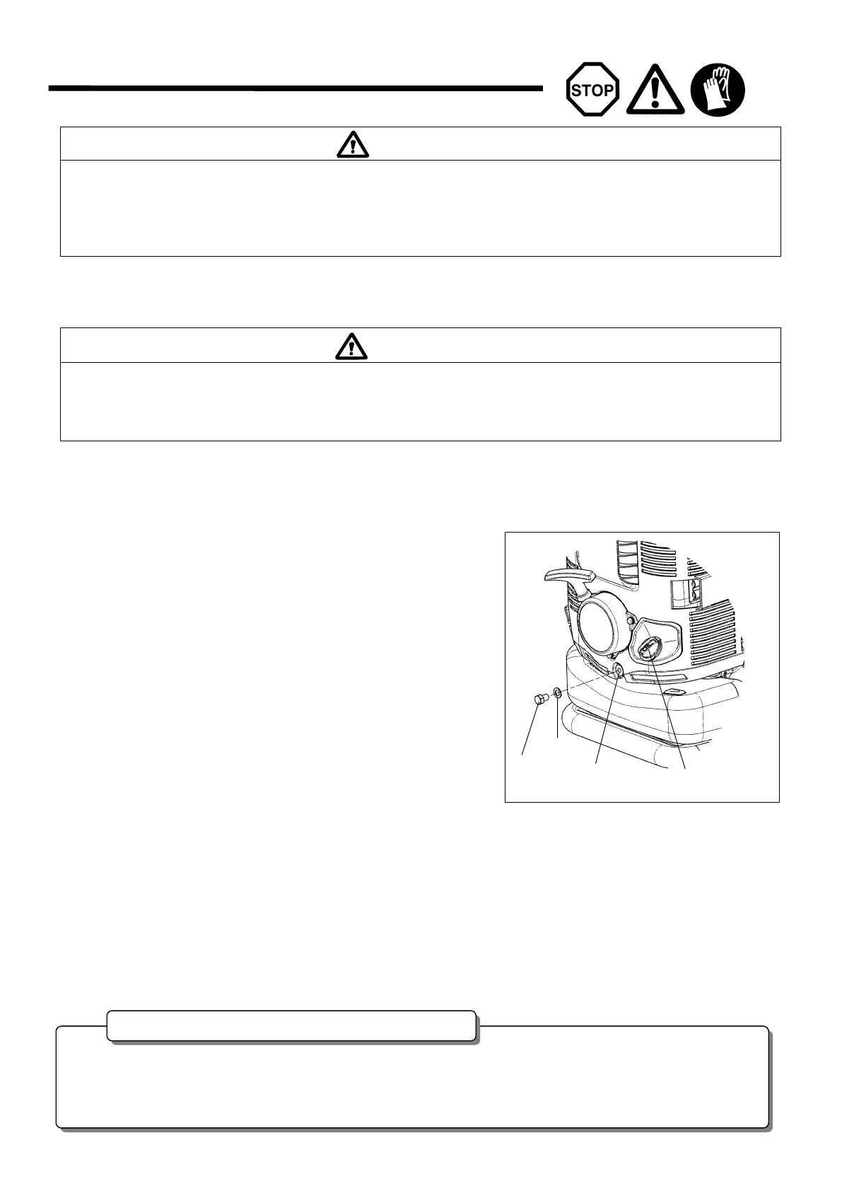 Avant l’inspection et la maintenance, arrêter le moteur et le laisser refroidir. Enlever également la bougie d’allumage et le capot de