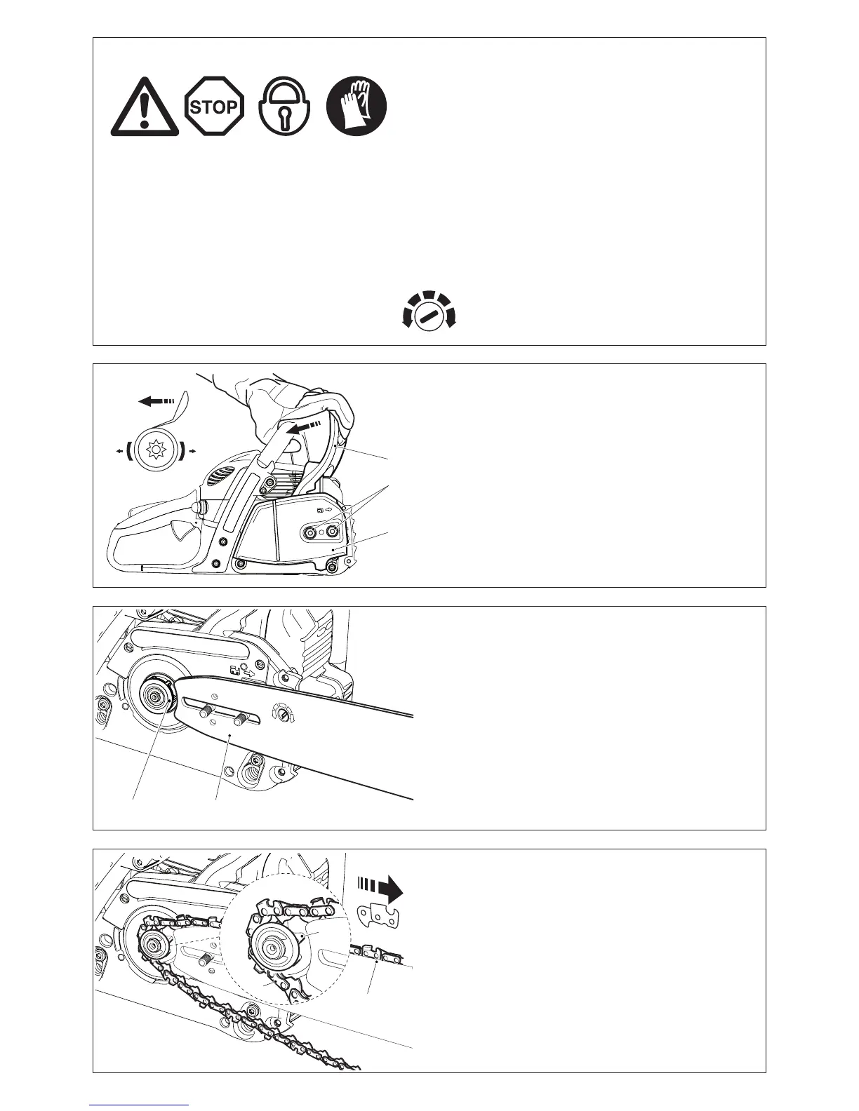 Desserrer le frein de chaîne. Pour cela, tirer le protège-main