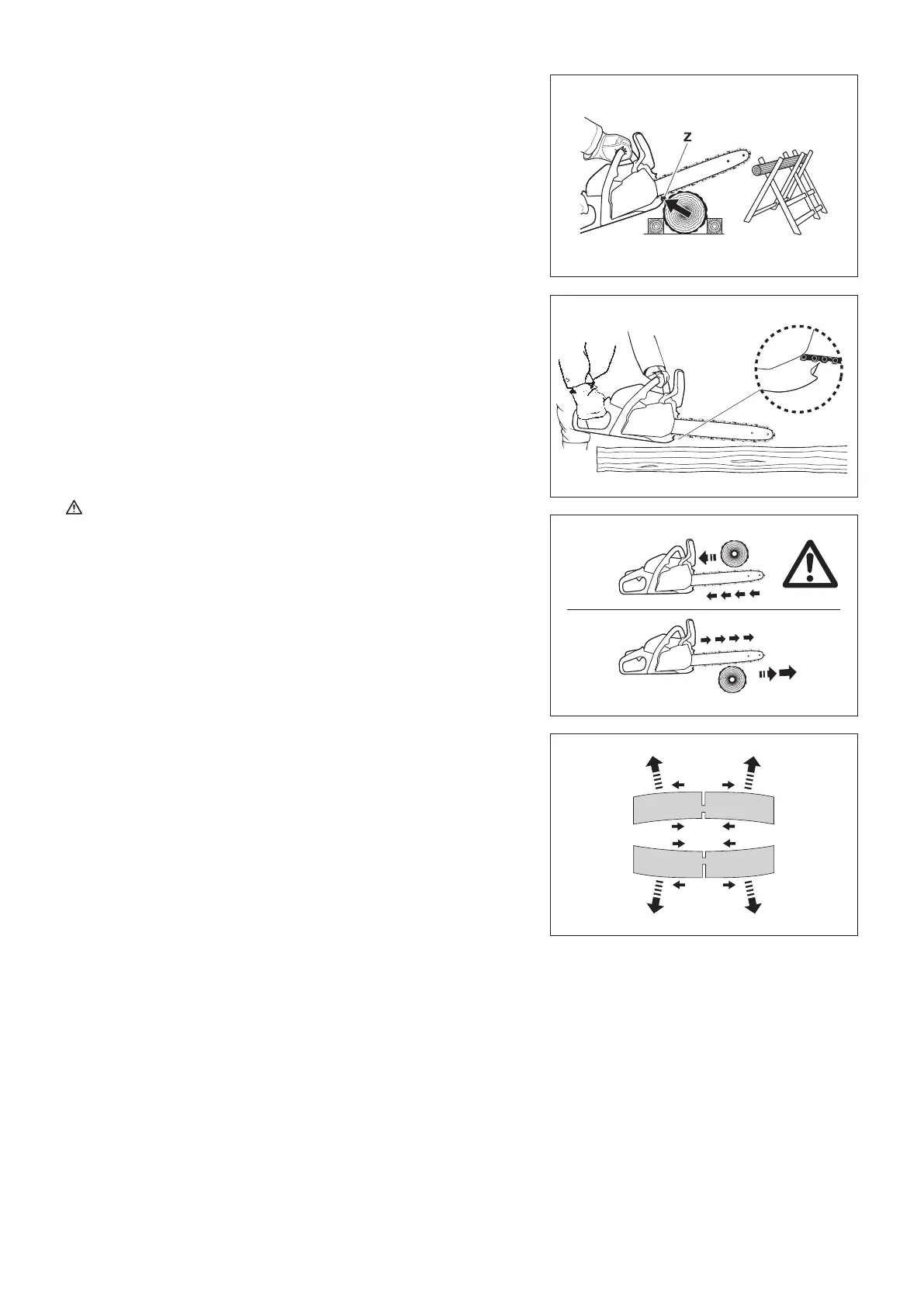 • Die Säge muss stets laufen, wenn Sie die Motorsäge aus dem Holz entfernen.