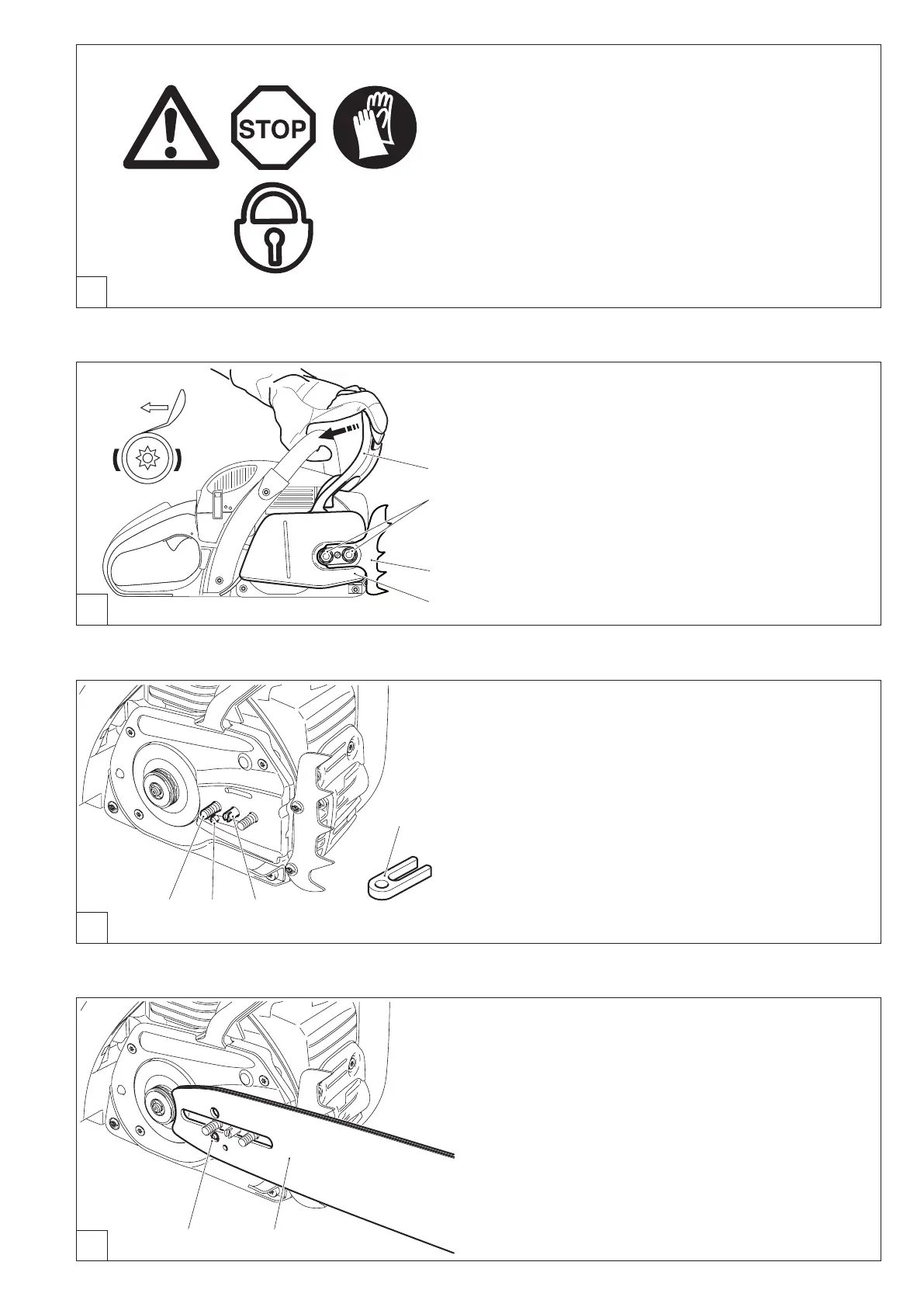 Release the chain brake by pulling the hand guard (1) in direc-