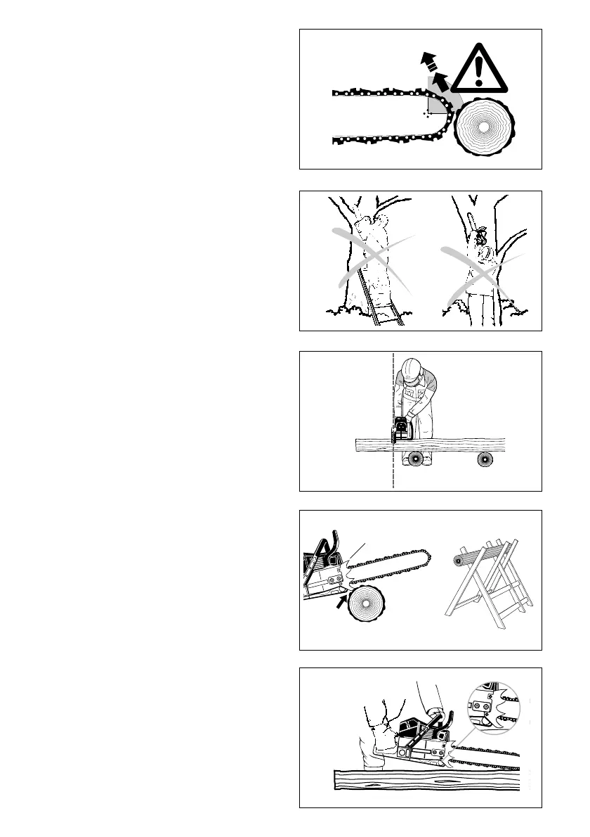 - Never climb up into trees to perform sawing with the chain