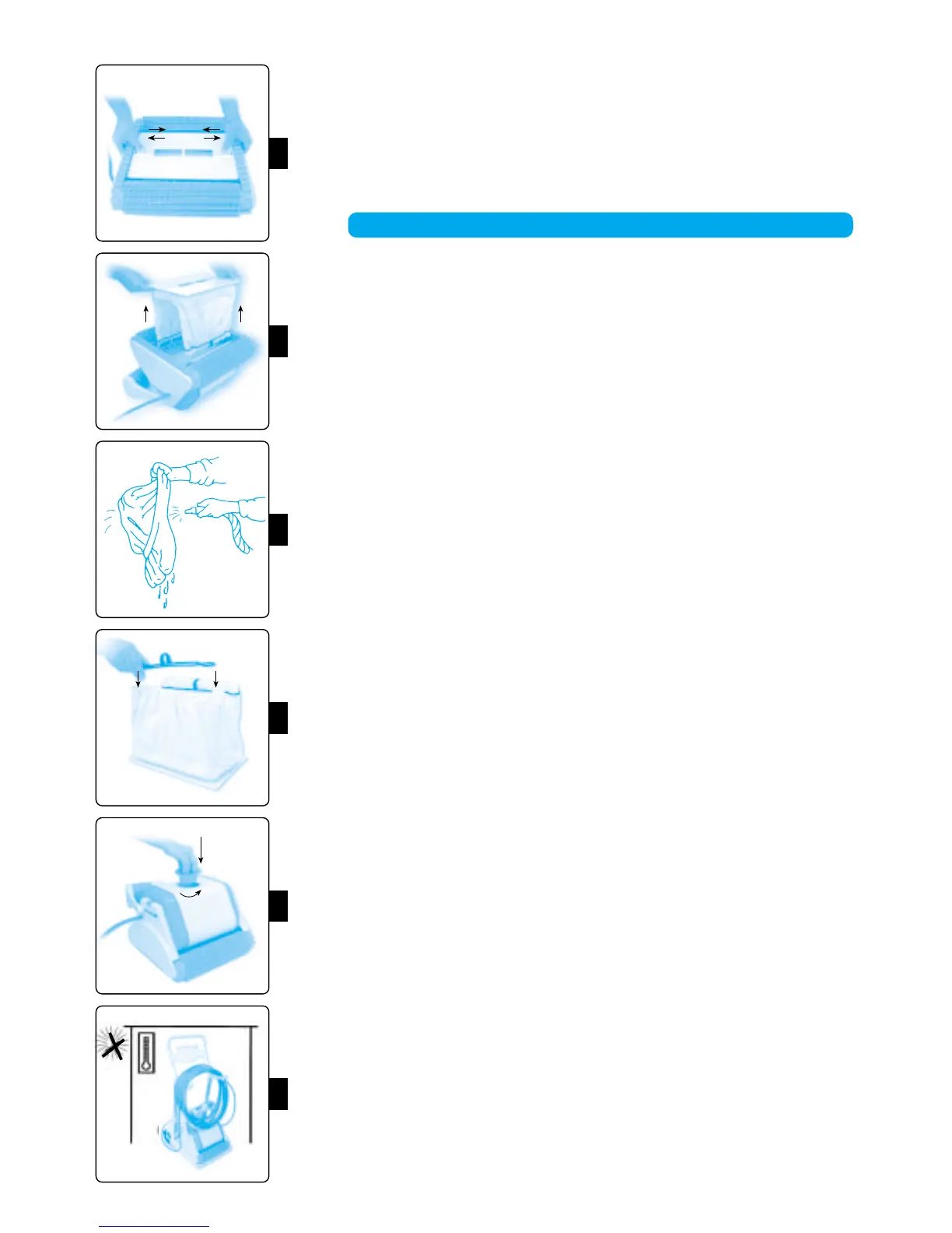 • Remove the 2 black filter bag clips (#7 p.5) and the filter bag (#8 p.5).