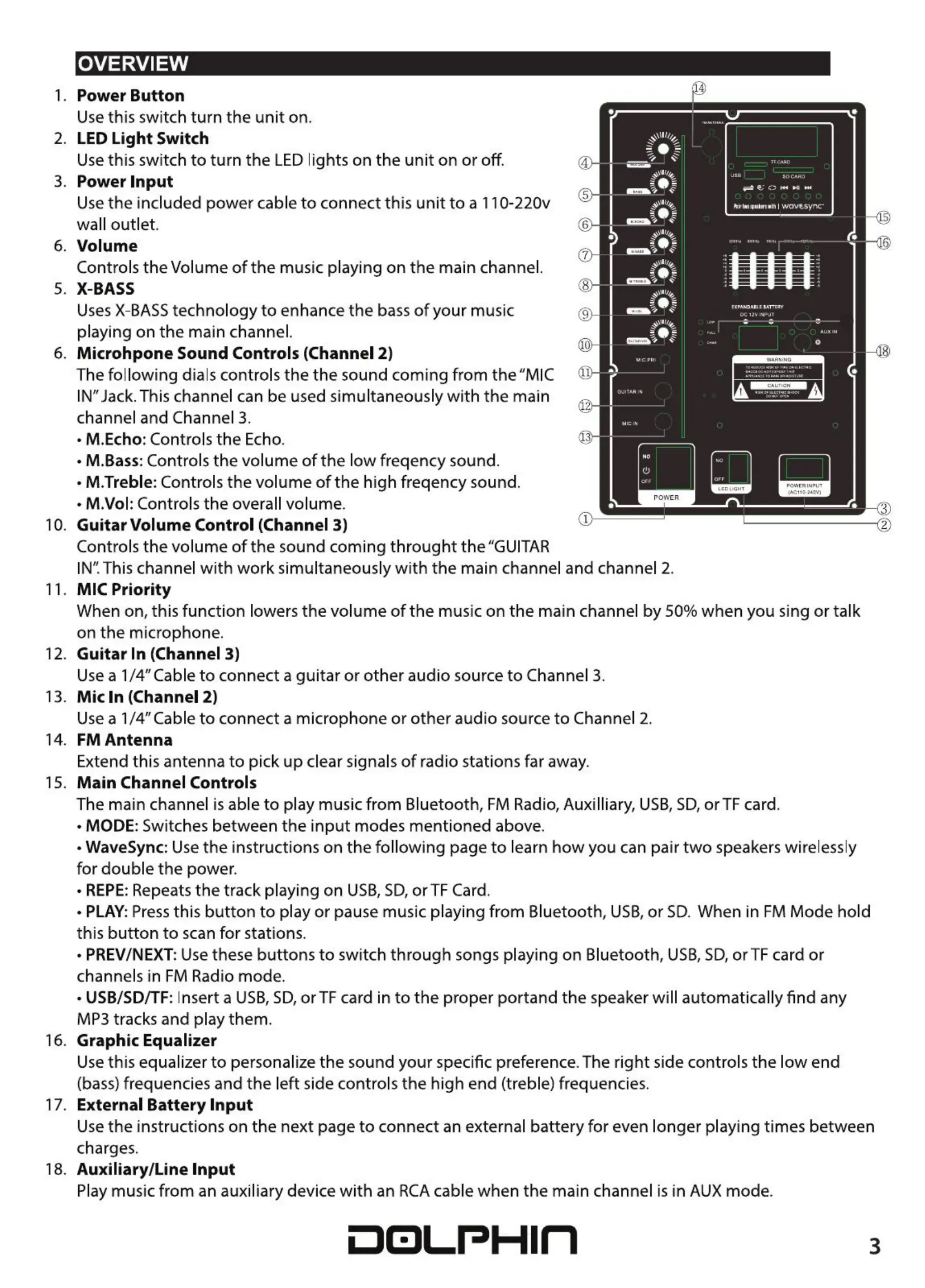 • PLAY: Press this button to play or pause music playing from Bluetooth, USBaor SD When in FM Mode hold