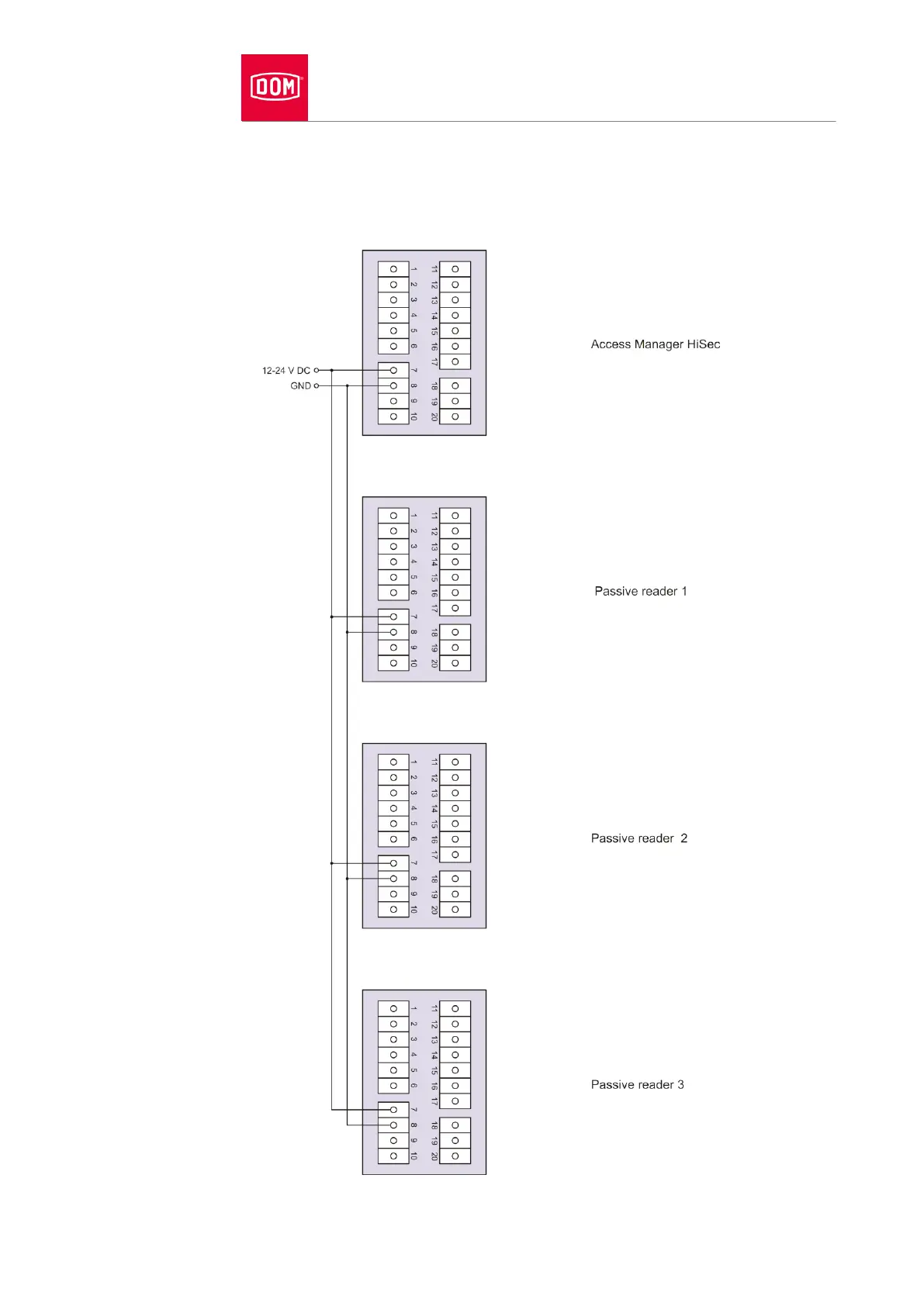 DOM ELS Access Manager V8 - Connecting the Access Manager to the Power Supply with Three Passive Readers (Hisec)
