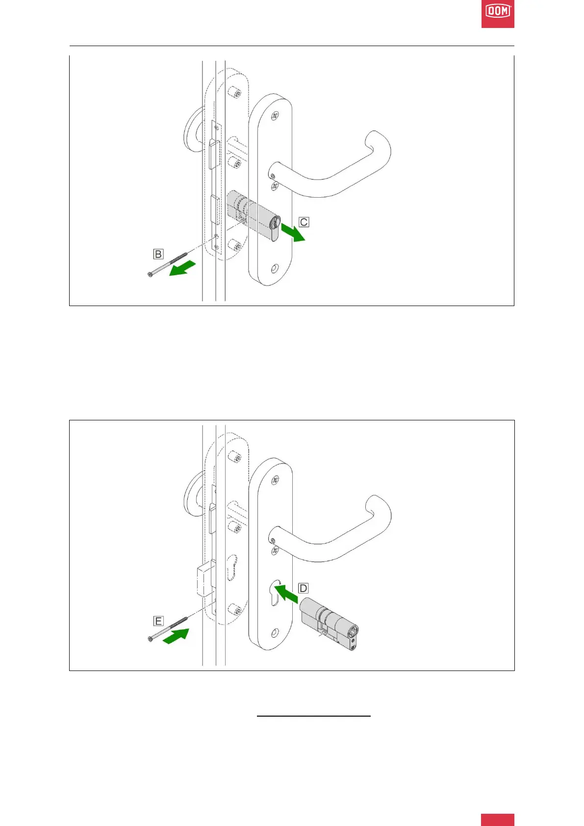 4. Insert new cylinder (with closing lug in home position, page 13) from the inside. (D)