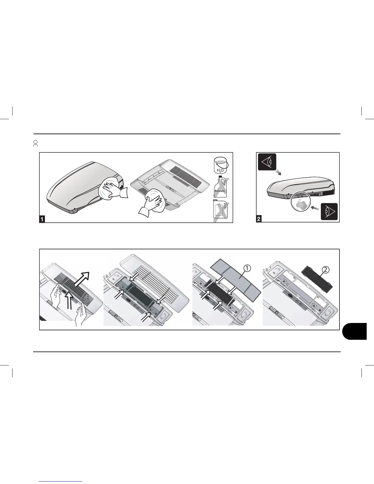 Rengøring af fi ltre (1); udfør denne operation jævnligt ved at vaske fi ltrene med et rengøringsmiddel og lade dem tørre, før de monteres.