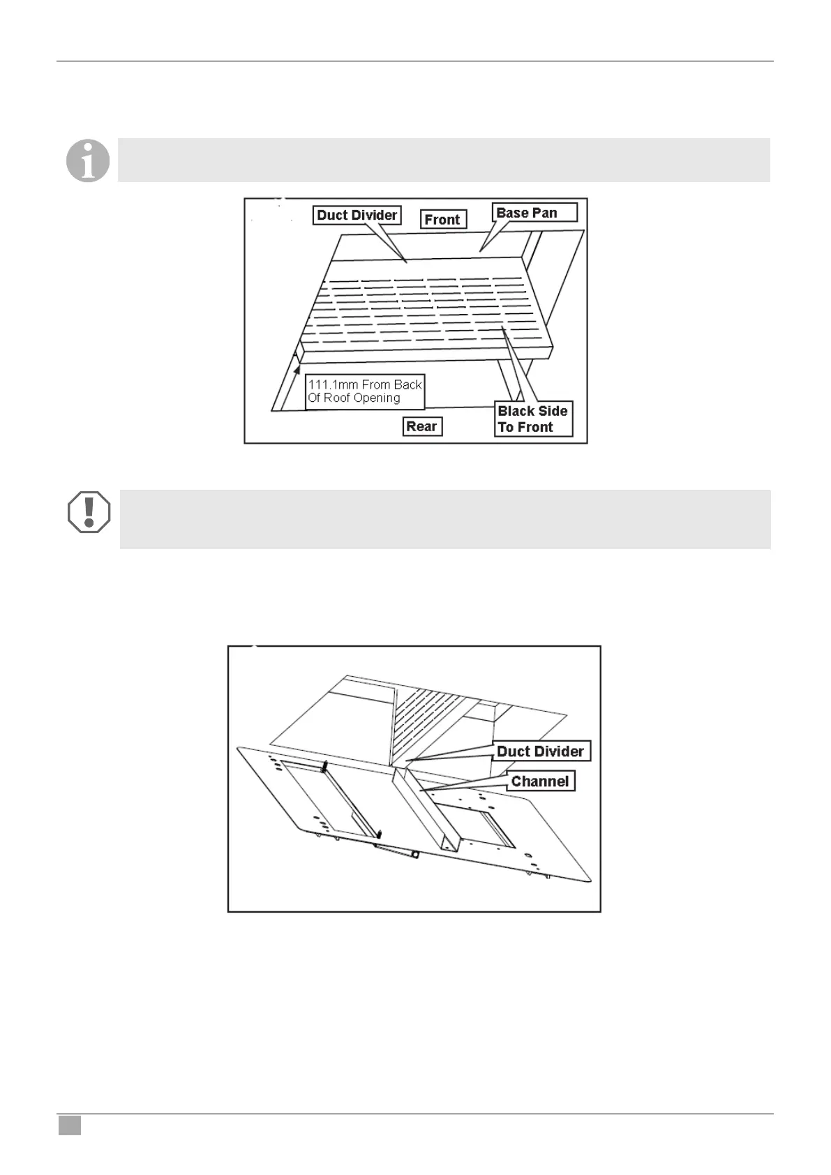 ➤ Carefully install the duct divider in the roof opening 111.1mm from back of roof opening.