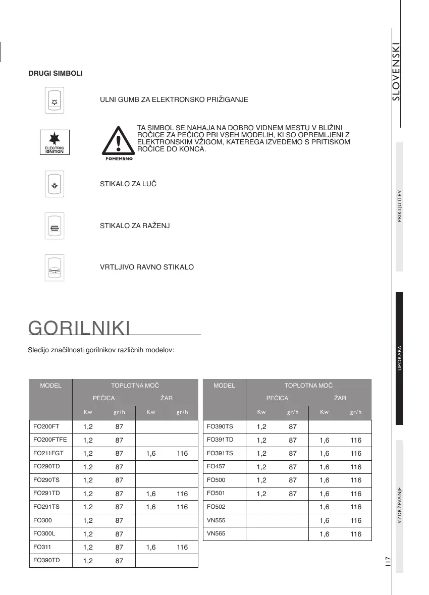 Sledijo značilnosti gorilnikov različnih modelov: