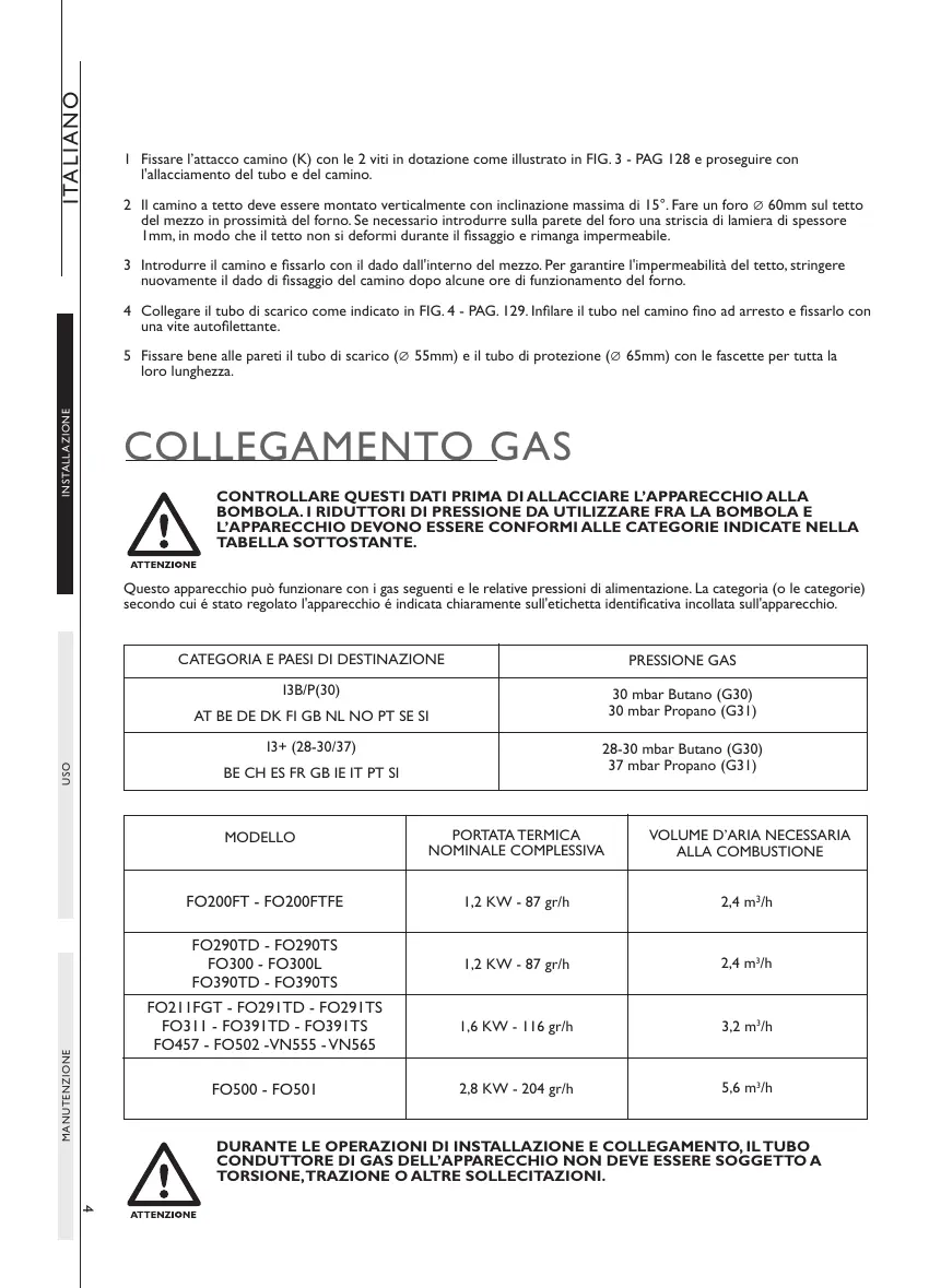 4 Collegare il tubo di scarico come indicato in FIG. 4 - PAG. 129. Infilare il tubo nel camino fino ad arresto e fissarlo con
