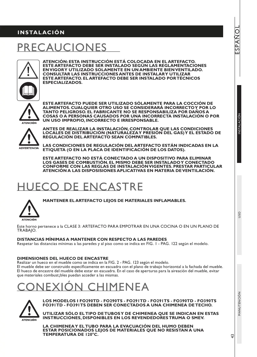 Respetar las distancias mínimas a las paredes y al piso como se indica en FIG. 1 - PAG. 122 según el modelo.
