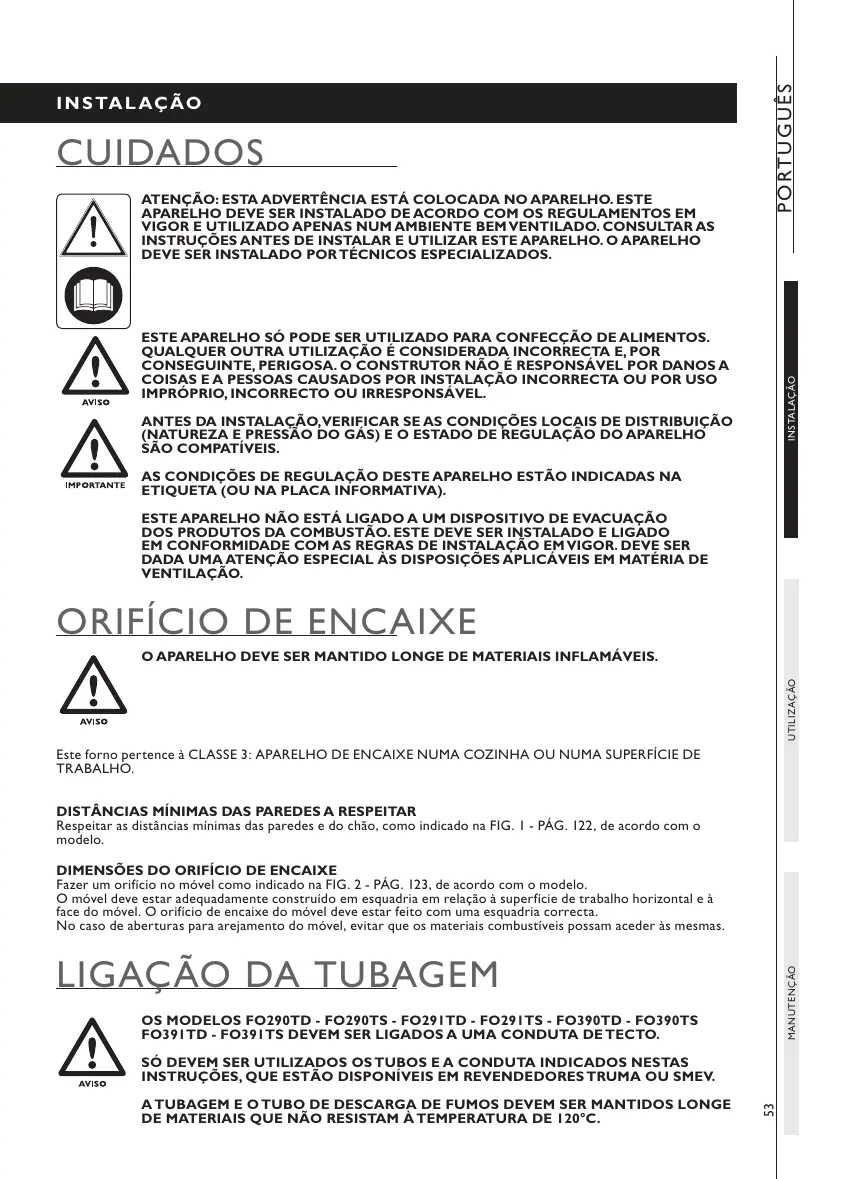 Respeitar as distâncias mínimas das paredes e do chão, como indicado na FIG. 1 - PÁG. 122, de acordo com o