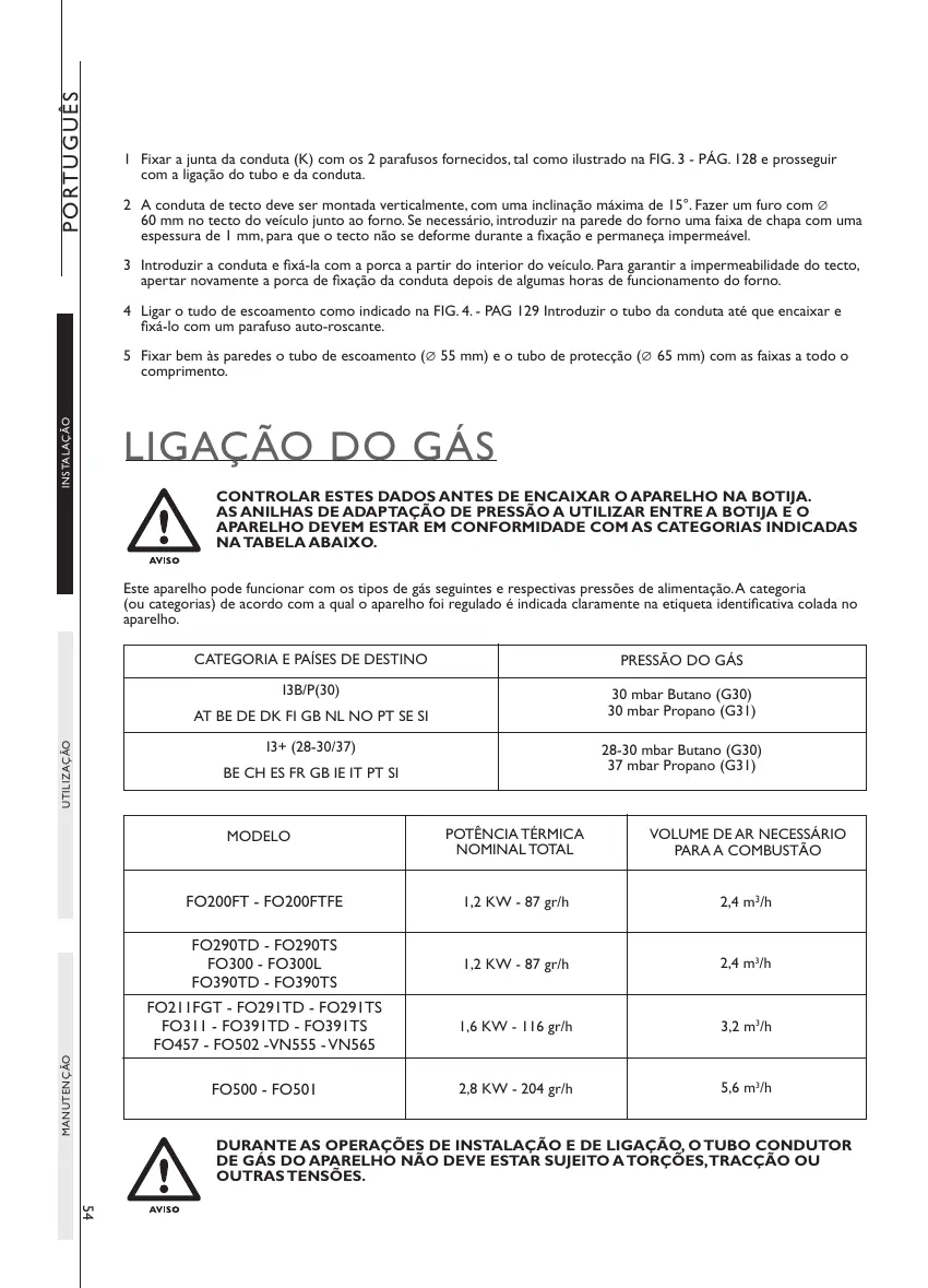 DE GÁS DO APARELHO NÃO DEVE ESTAR SUJEITO A TORÇÕES, TRACÇÃO OU