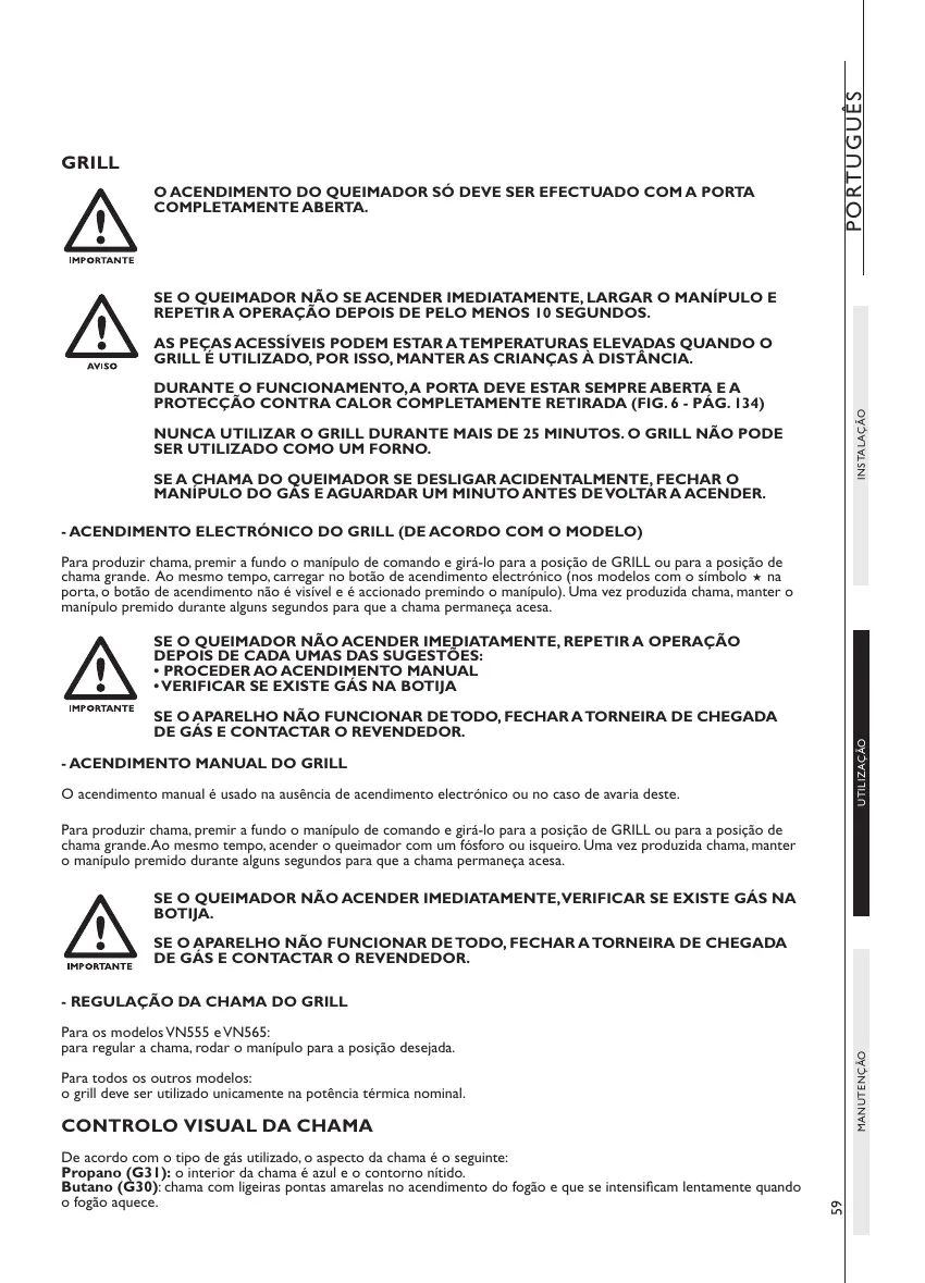 Para produzir chama, premir a fundo o manípulo de comando e girá-lo para a posição de GRILL ou para a posição de