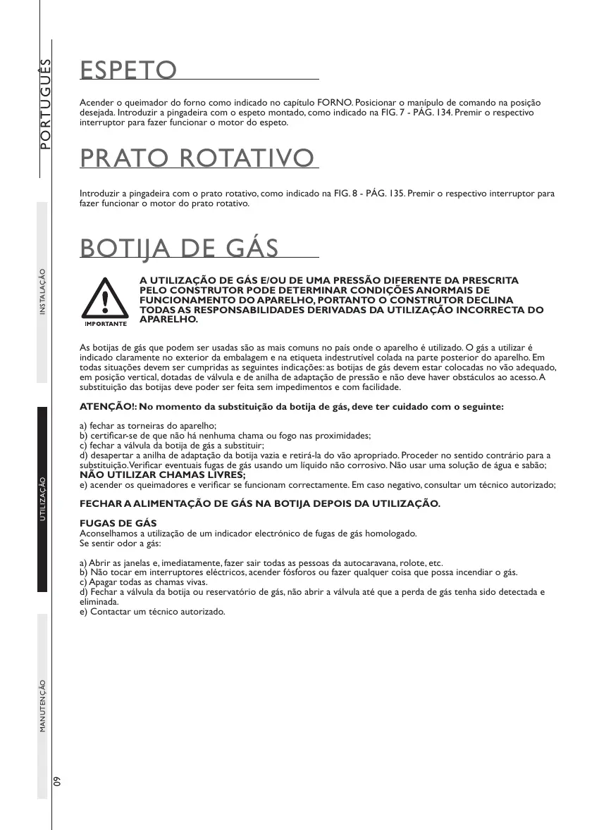 substituição. Verificar eventuais fugas de gás usando um líquido não corrosivo. Não usar uma solução de água e sabão;