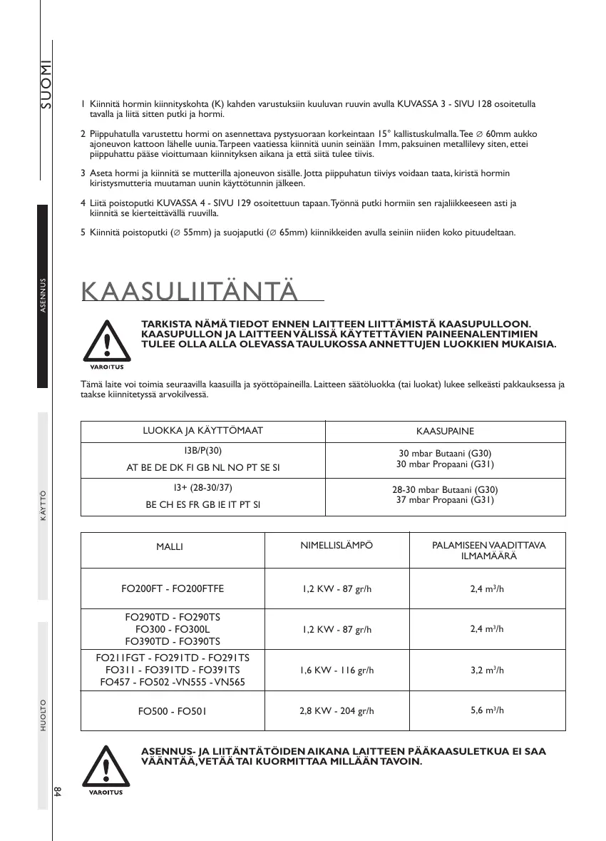 ASENNUS- JA LIITÄNTÄTÖIDEN AIKANA LAITTEEN PÄÄKAASULETKUA EI SAA