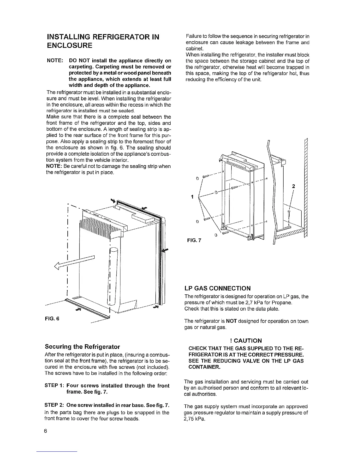 Dometic RM 2350 - Installing Refrigerator in Enclosure; LP Gas Connection; Securing the Refrigerator
