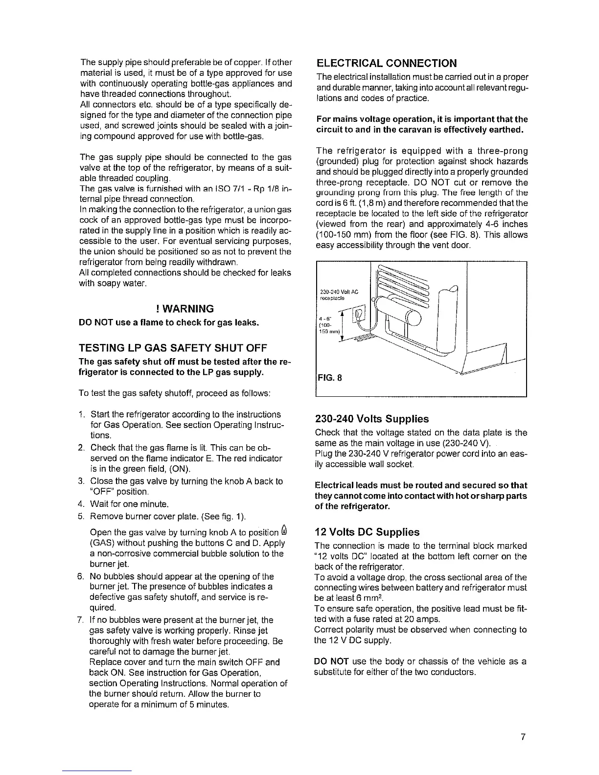 Dometic RM 2350 - Electrical Connection; Testing Lp Gas Safety Shut off; 230-240 Volts Supplies