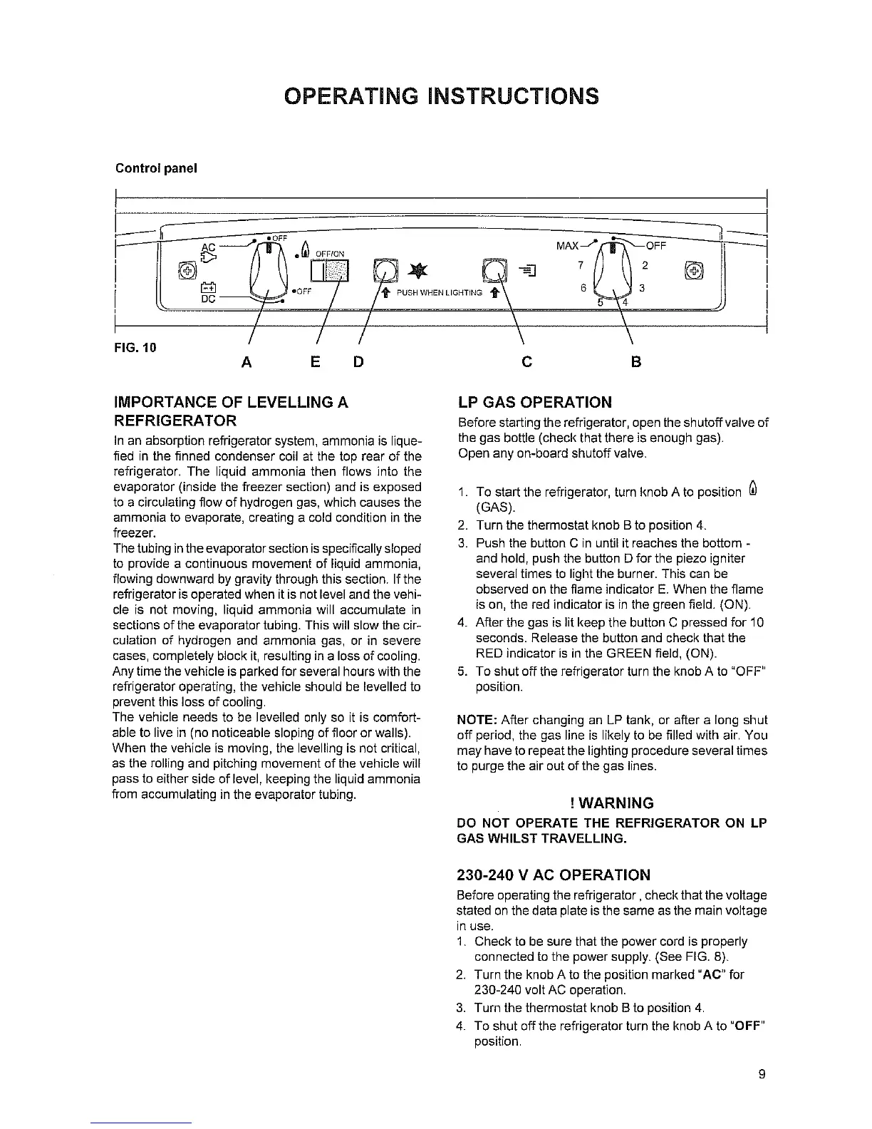 Dometic RM 2350 - Operating Instructions; Control Panel; Importance of Levelling a Refrigerator; LP Gas Operation