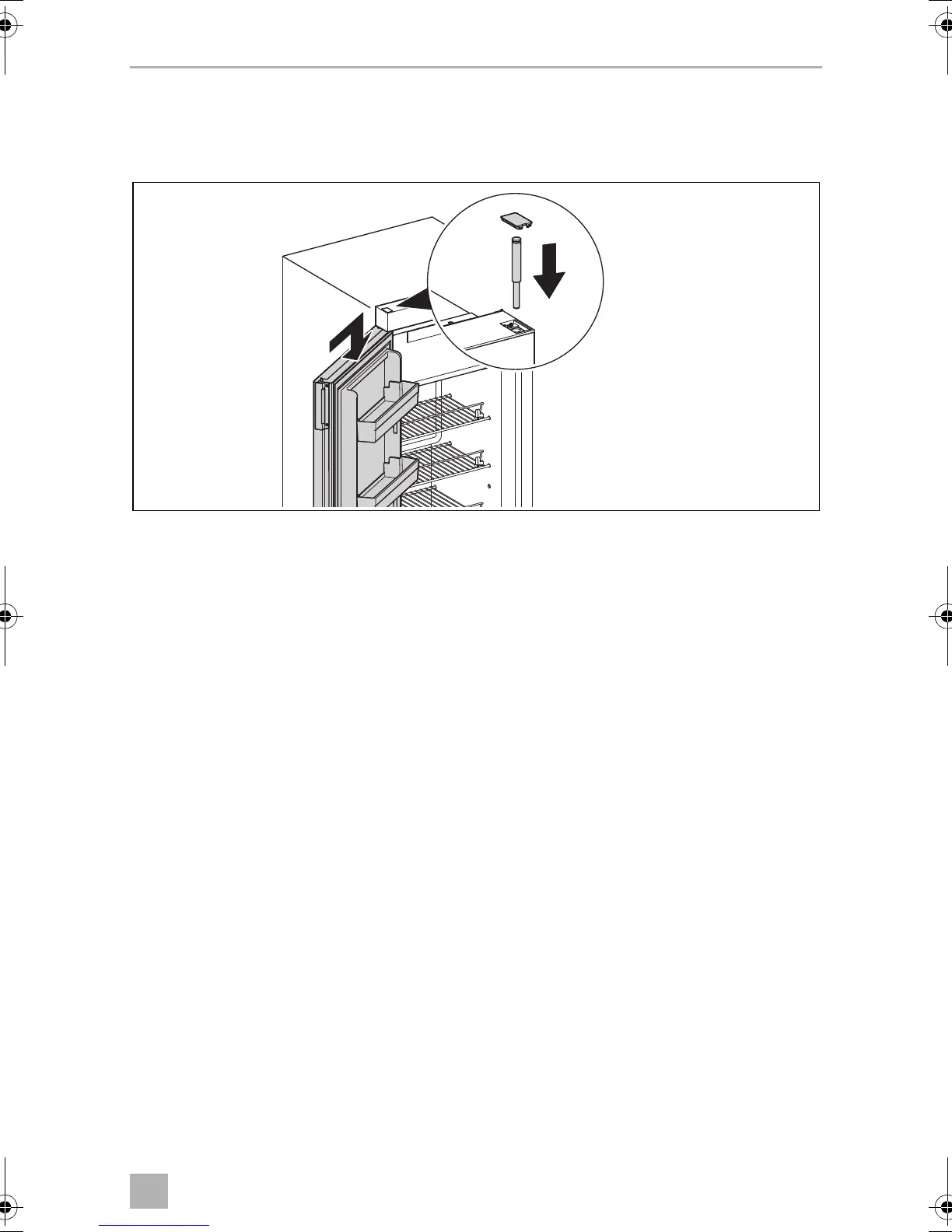 ➤ Position the refrigerator door on the hinge pin of the newly mounted lower