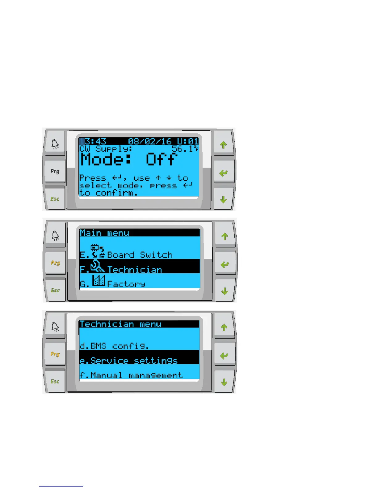 2. To access the maintenance mode menu, press Prg and scroll to technician, press enter.