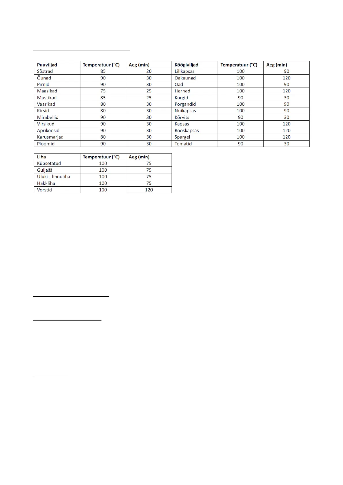 Juhendis toodud tabelid on ainult näitlikud. Temperatuuri saavutamiseks kuluv aeg võib erineda,