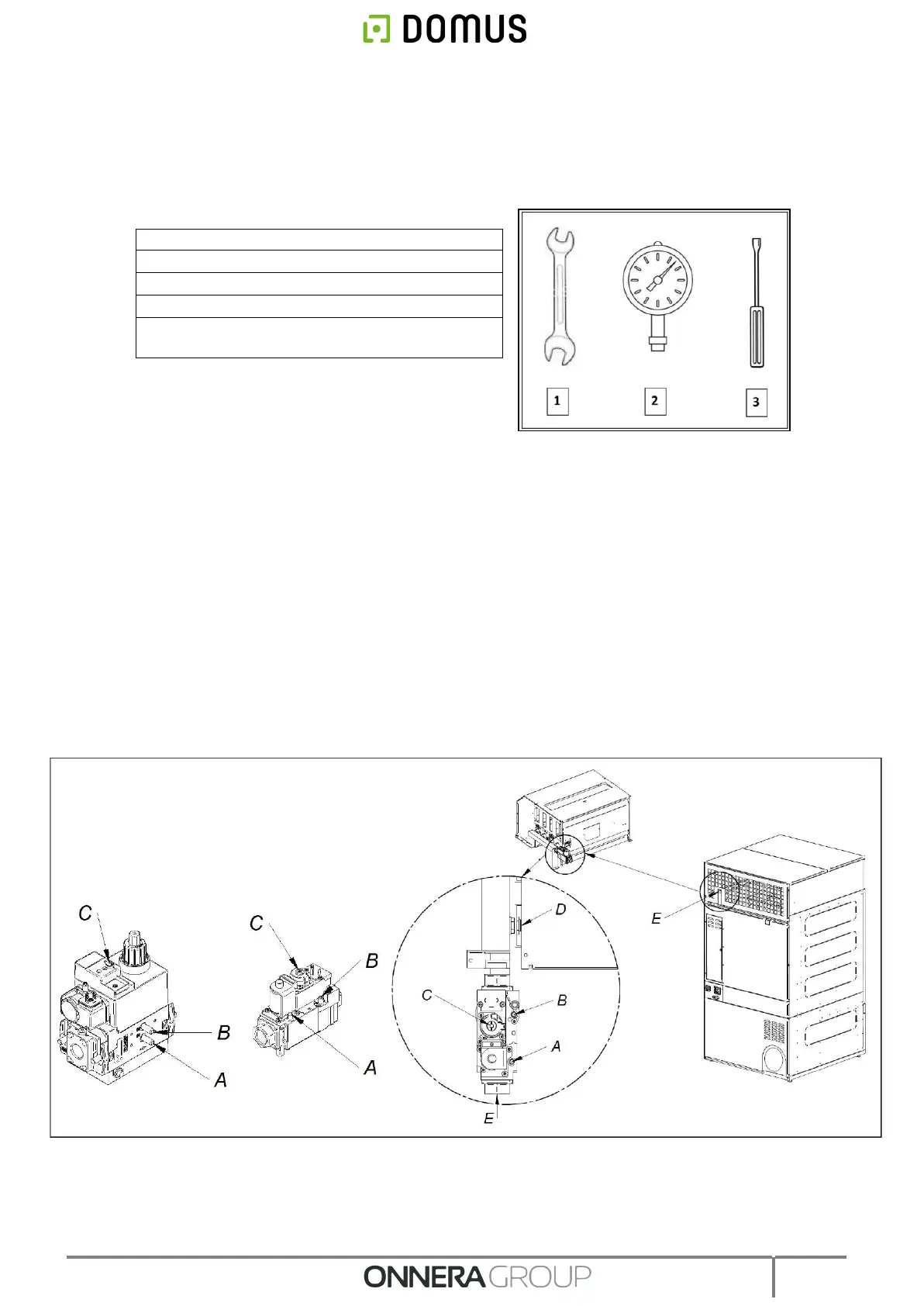 7- Regular el tornillo “C” de entrada de gas hasta llegar a la presión requerida según la tabla de presiones y
