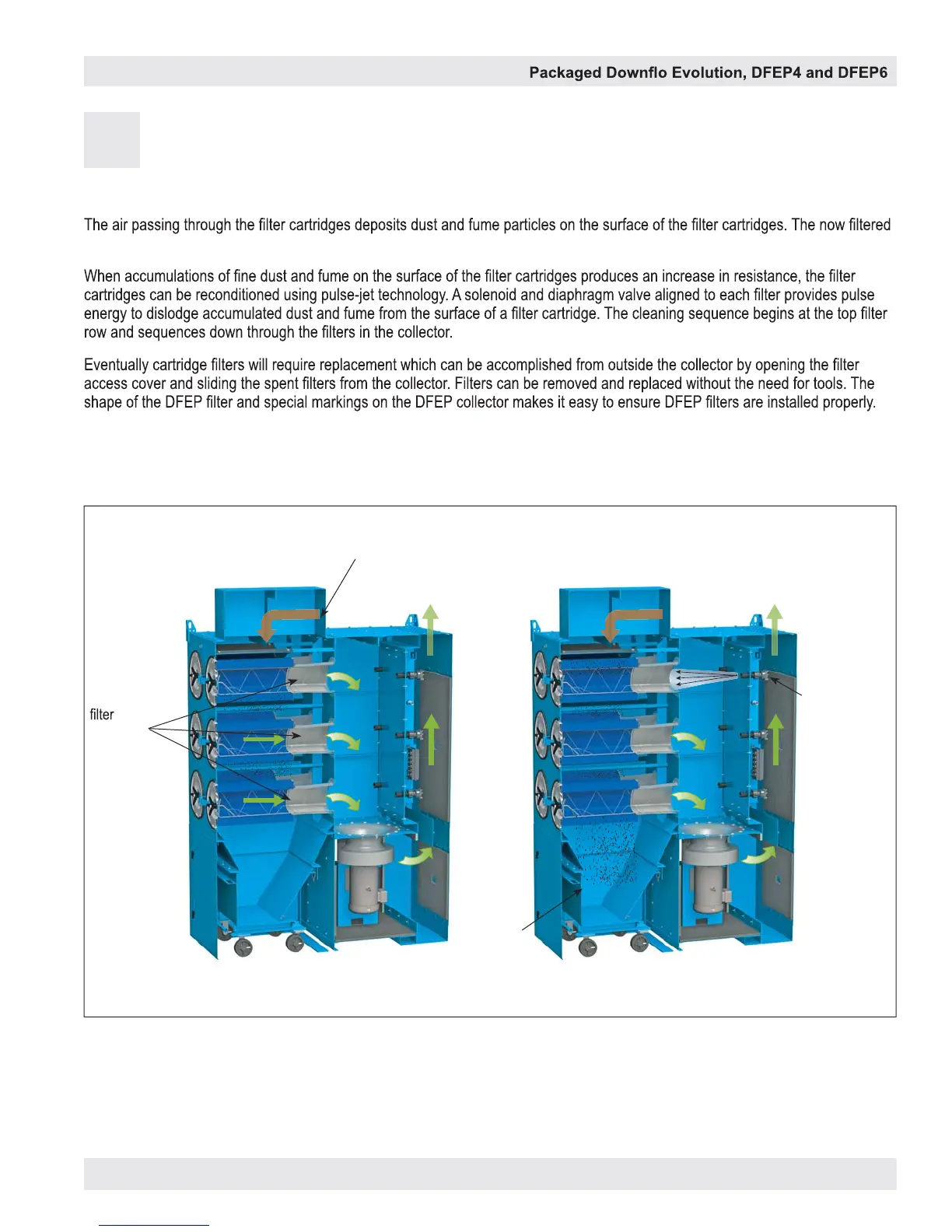 collector. The dust-laden air is then directed downward through the collector body where heavier dust falls directly into the hopper.