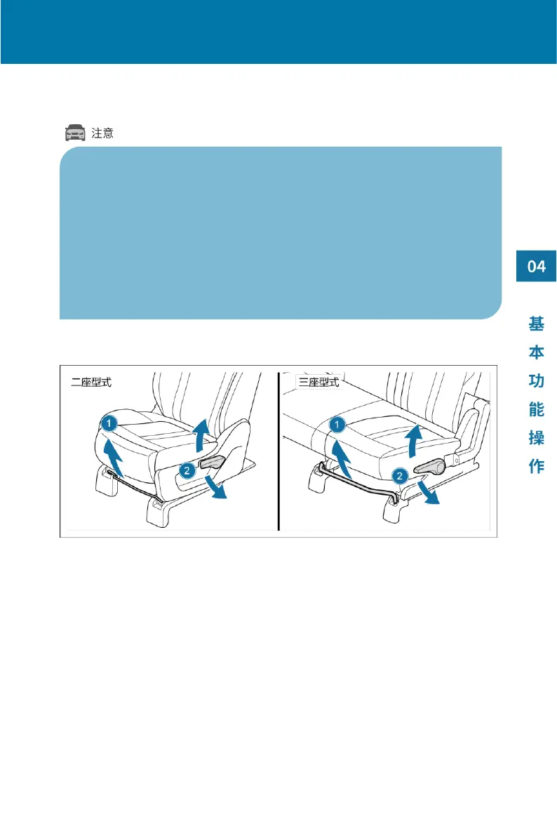 调节座椅时请勿将手放在座椅下方或移动的零件附近以免受伤。