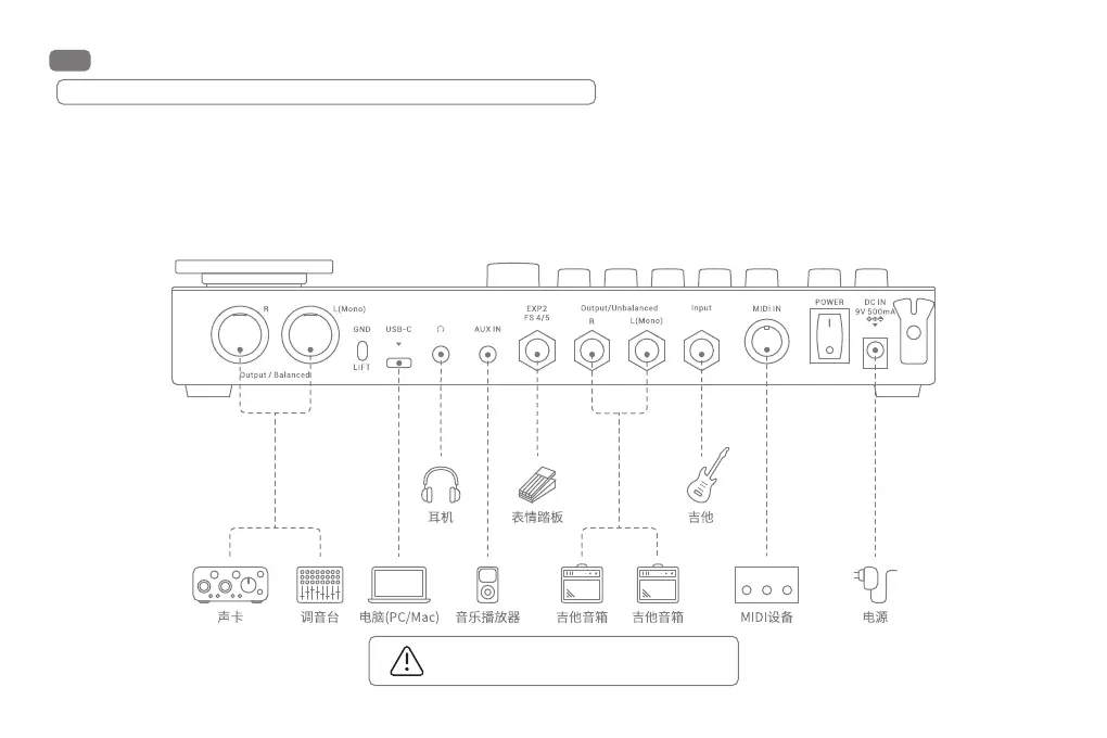4. Input和Unbalanced Output L/R必须使用1/4接头的单声道带屏蔽音频线如果仅需要单声道输出只需要连接L(Mono输出接口。高质量音频线可以保证干净和稳定的信号