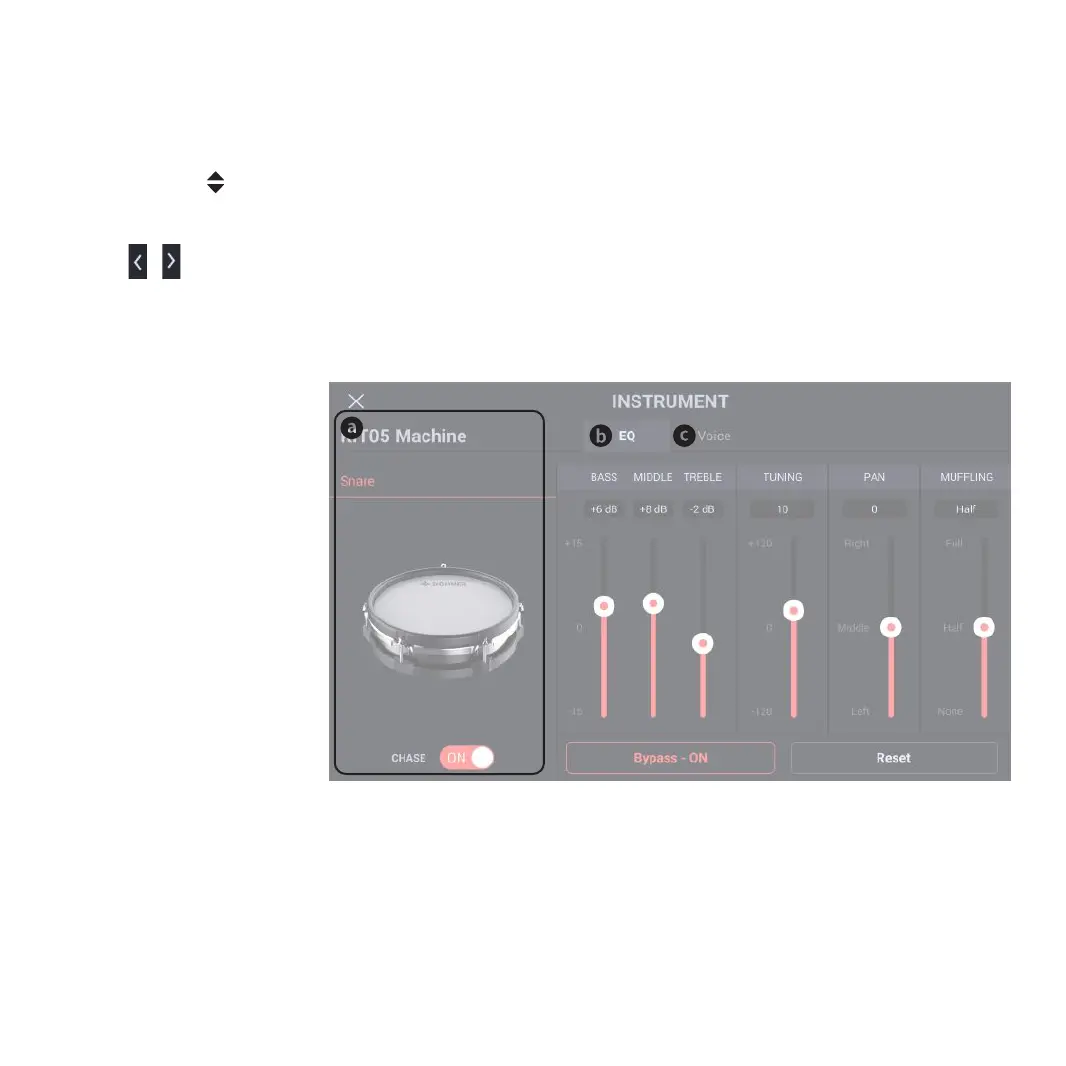 L'interface INSTRUMENT permet de régler le kit de batterie. L'égalisation, la sonorité et la LED du kit de batterie actuel peuvent être combinés et sauvegardés en