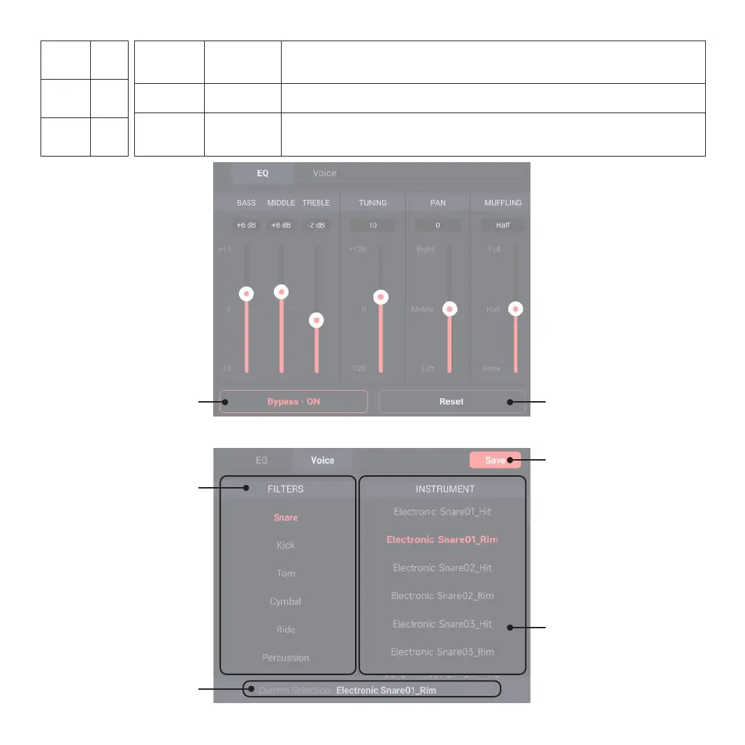 L'image sonore du fût actuel est réglée. Les valeurs par défaut sont Middle(Milieu), Left(Gauche) et