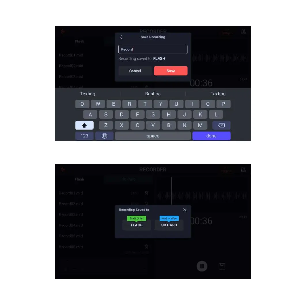 fichiers MIDI uniquement et ne peuvent pas être exportés, tandis que les fichiers sauvegardés sur Carte SD peuvent être sauvegardés en tant que fichiers MIDI +