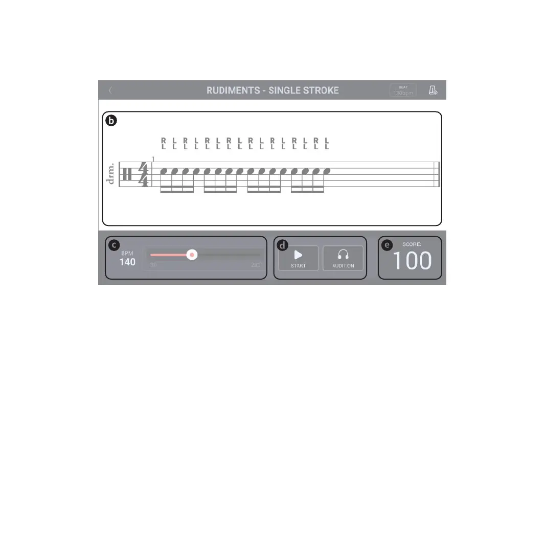 In der RUDIMENTS-Übungsschnittstelle gibt es 40 verschiedene Übungen, die darauf abzielen, die Fertigkeiten und das Rhythmusgefühl des Schlagzeugers zu