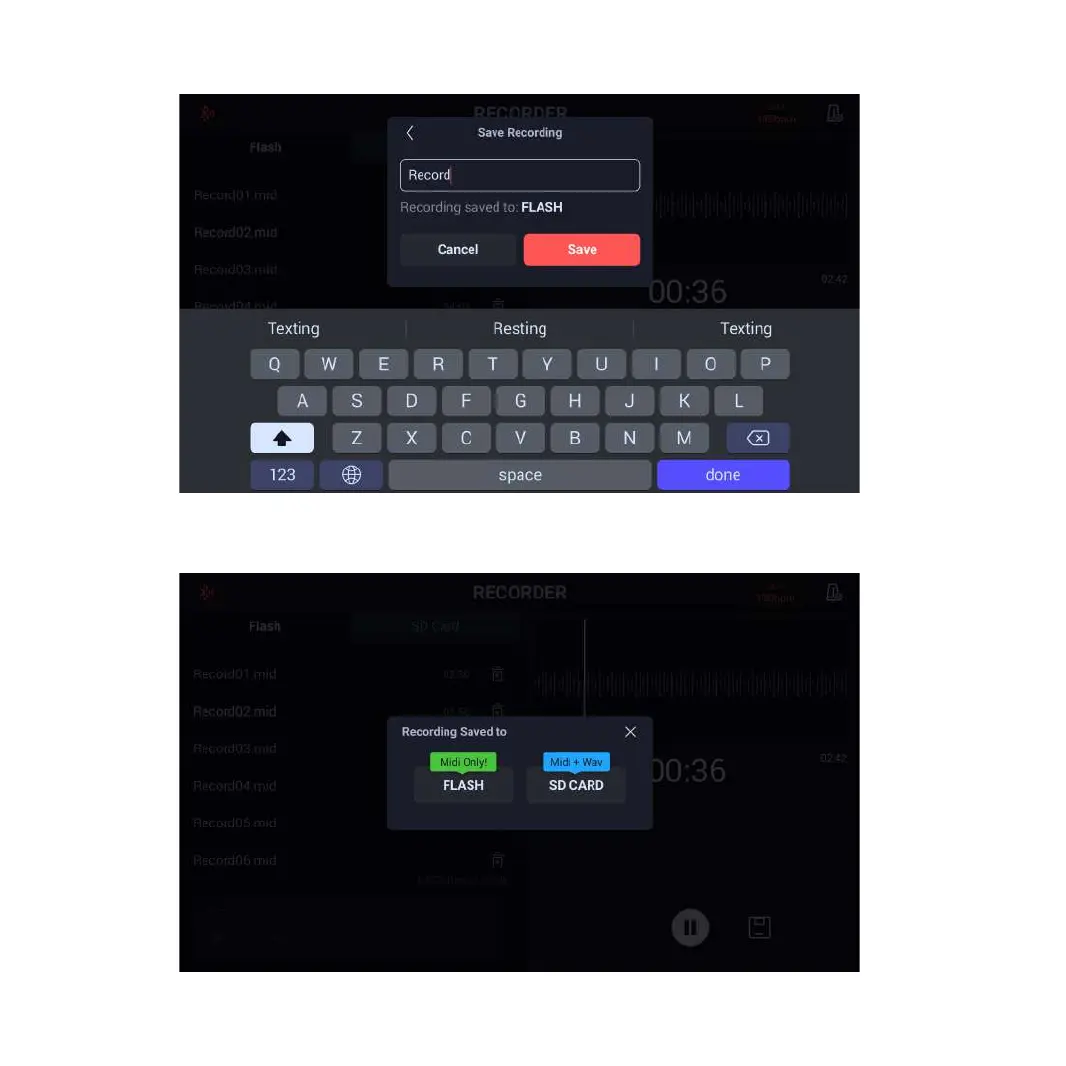 Die Aufnahmedateien können auf FLASH oder einer SD-Karte gespeichert werden. Die in FLASH gespeicherten Dateien können nur als MIDI-Dateien gespeichert