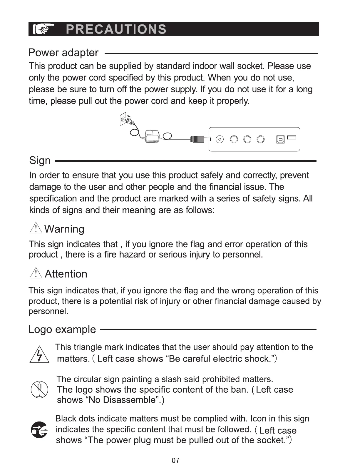 specification and the product are marked with a series of safety signs. All