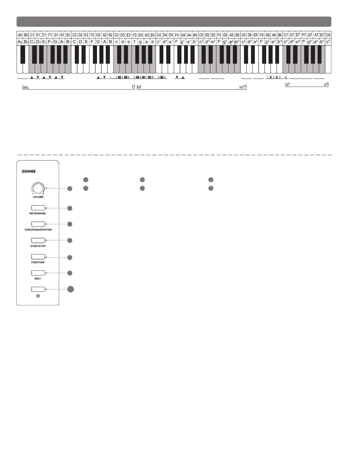 1. Long press the "TONE/DEMO/RHYTHM" button and simultaneously press any black and white key in the demo area (#A2-f) to enter the Music Mode.