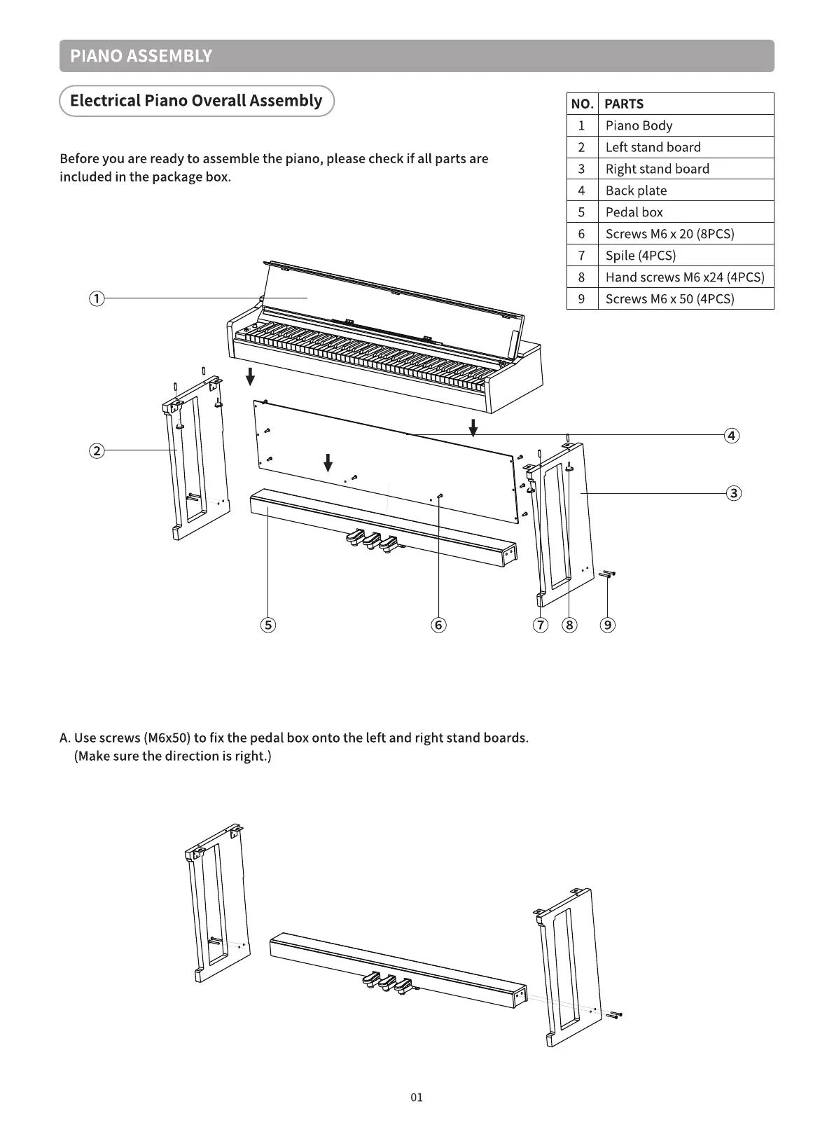 Before you are ready to assemble the piano, please check if all parts are