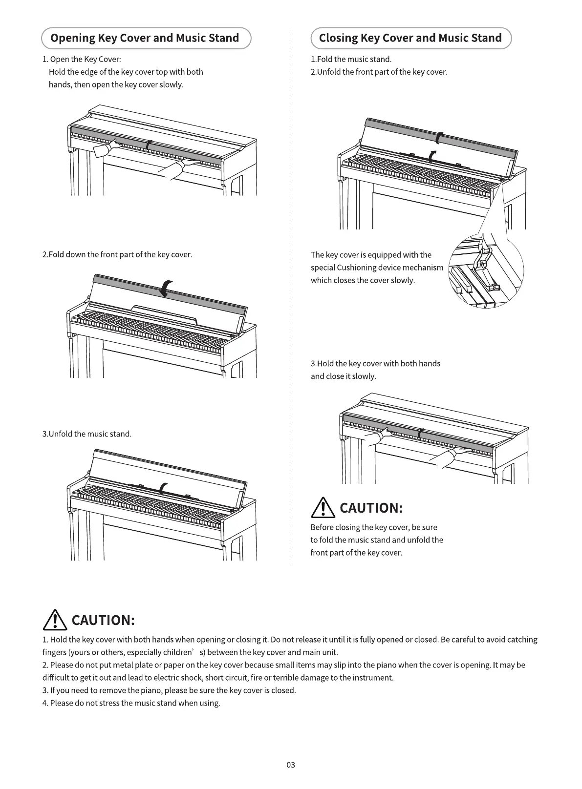 2. Pleasedo not put metal plate or paper on the key cover becausesmall items may slip into the piano when the cover is opening. It may be