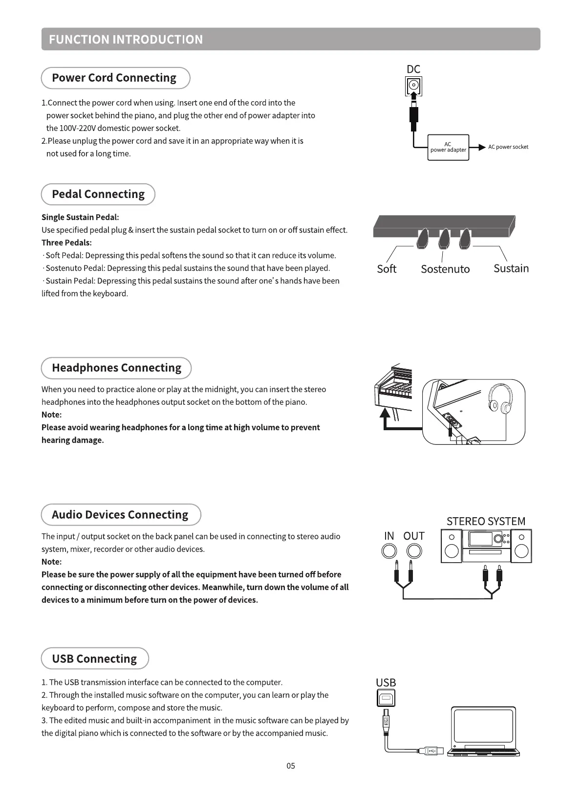 Usespecified pedal plug & insert the sustain pedal socket to turn on or off sustain effect.