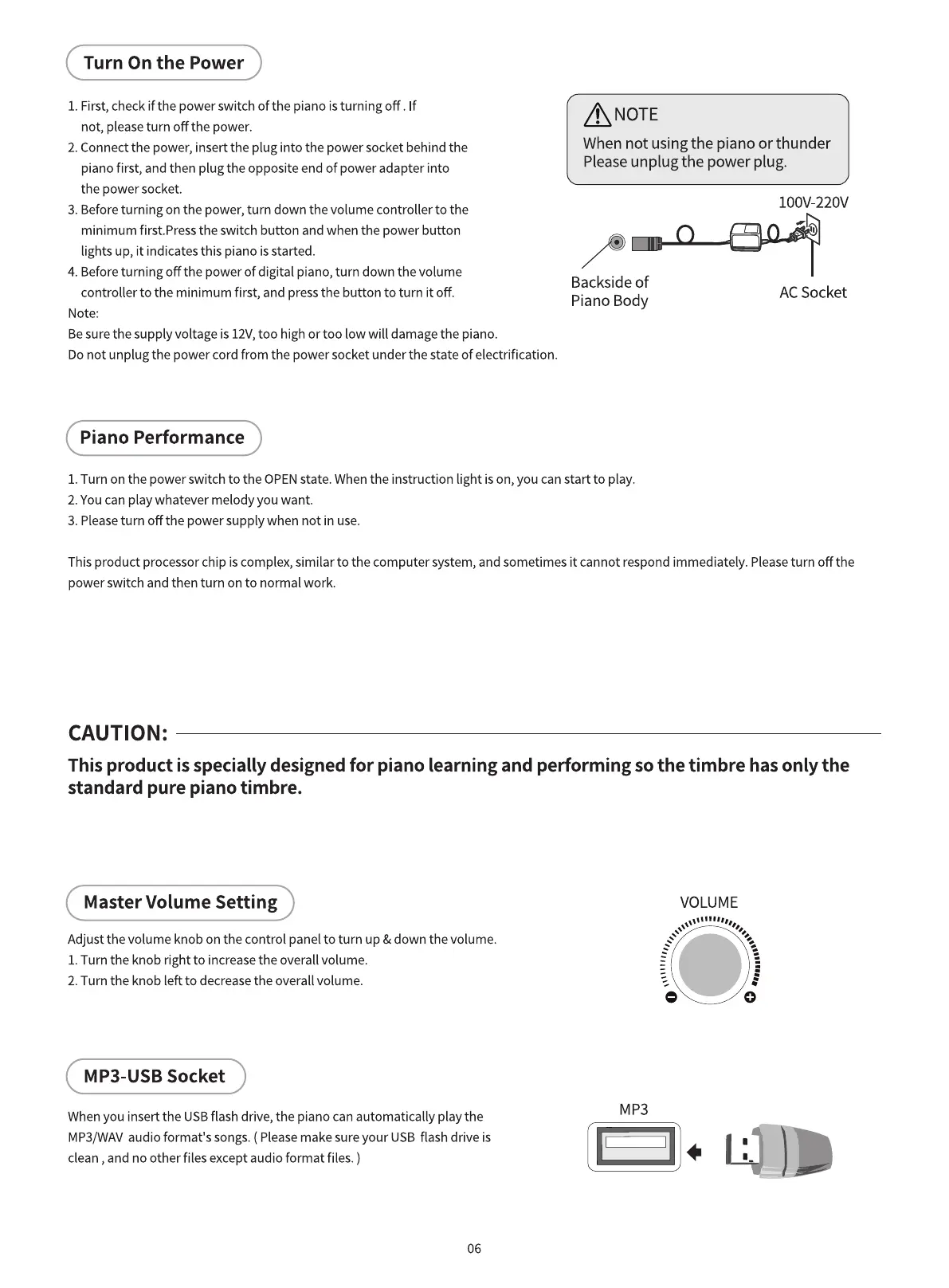 4. Beforeturning off the power of digital piano, turn down the volume