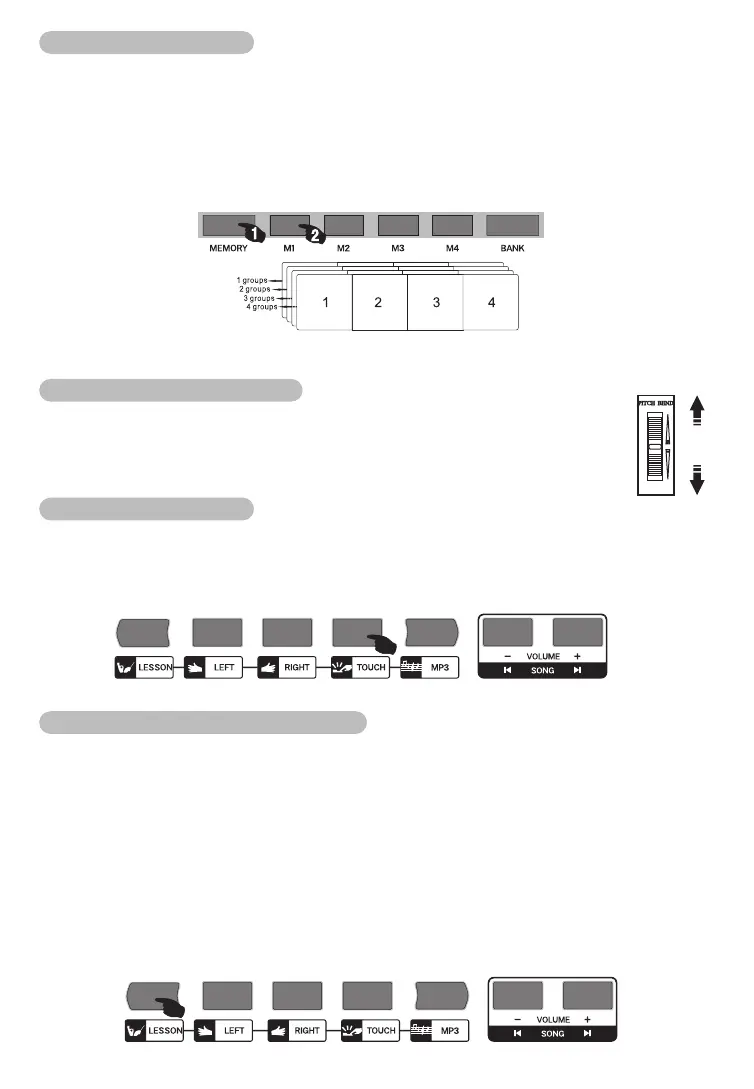 ・【BANK】を押して、4つのメモリーグループを選択でき、画面に「MENBACK」01-04が表示され