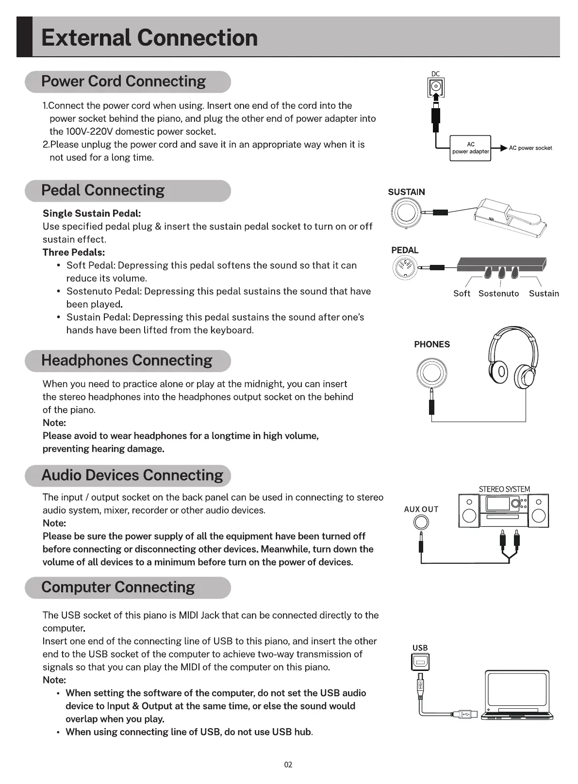 The USB socket of this piano is MIDl Jack that can be connected directly to the