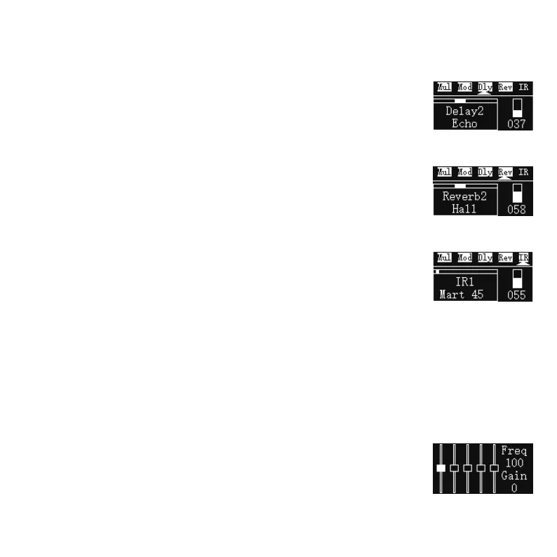 effets de retard: Analog, Echo, Dual, Tremolo et Lofi. Les valeurs de sortie des effets peuvent être