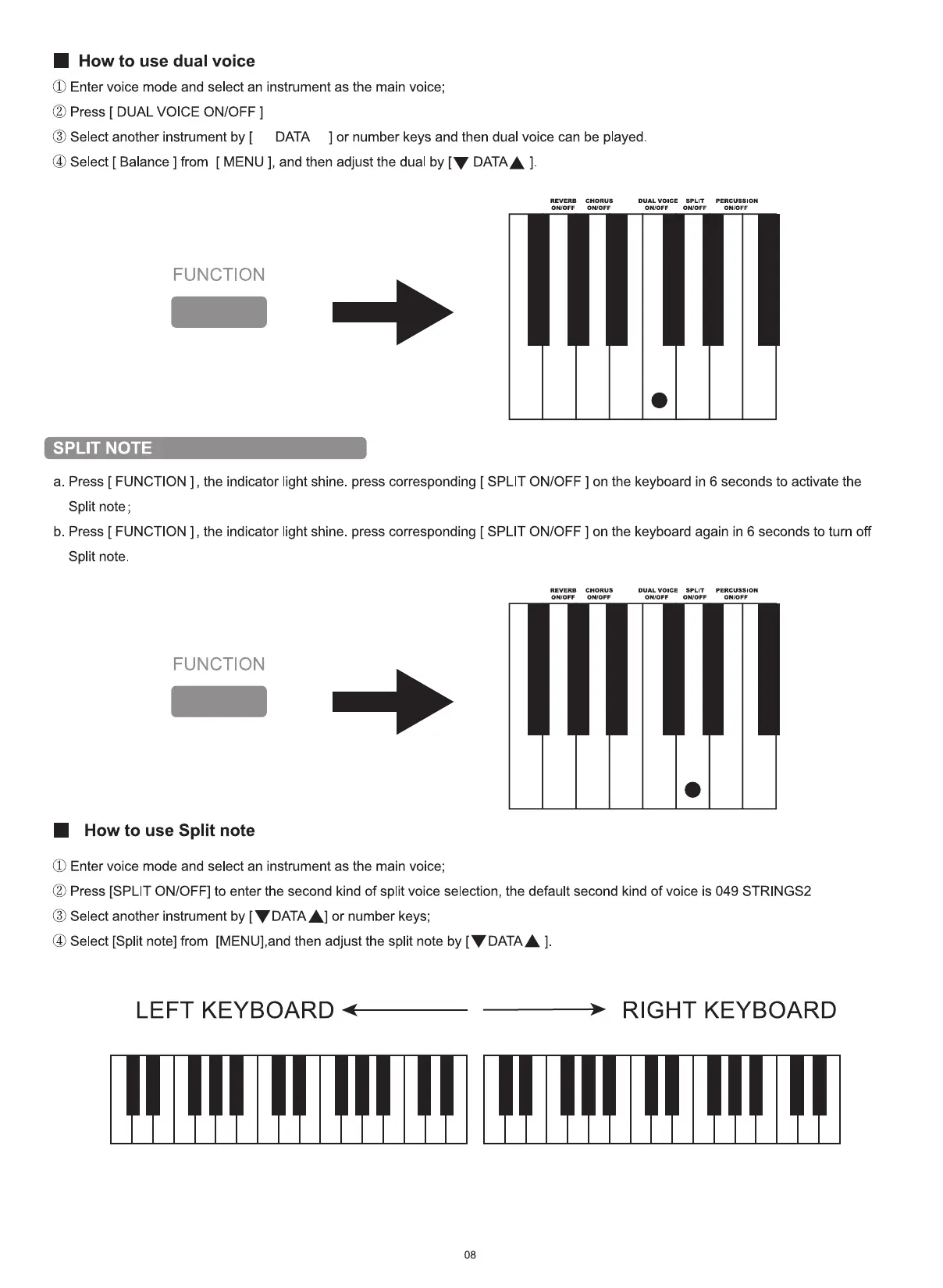 b. Press [ FUNCTION ] , the indicator light shine. press corresponding [ SPLIT ON/OFF ] on the keyboard again in 6 seconds to turn off