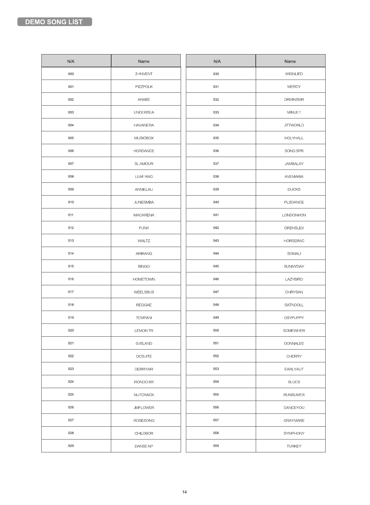 DEMO SONG LIST