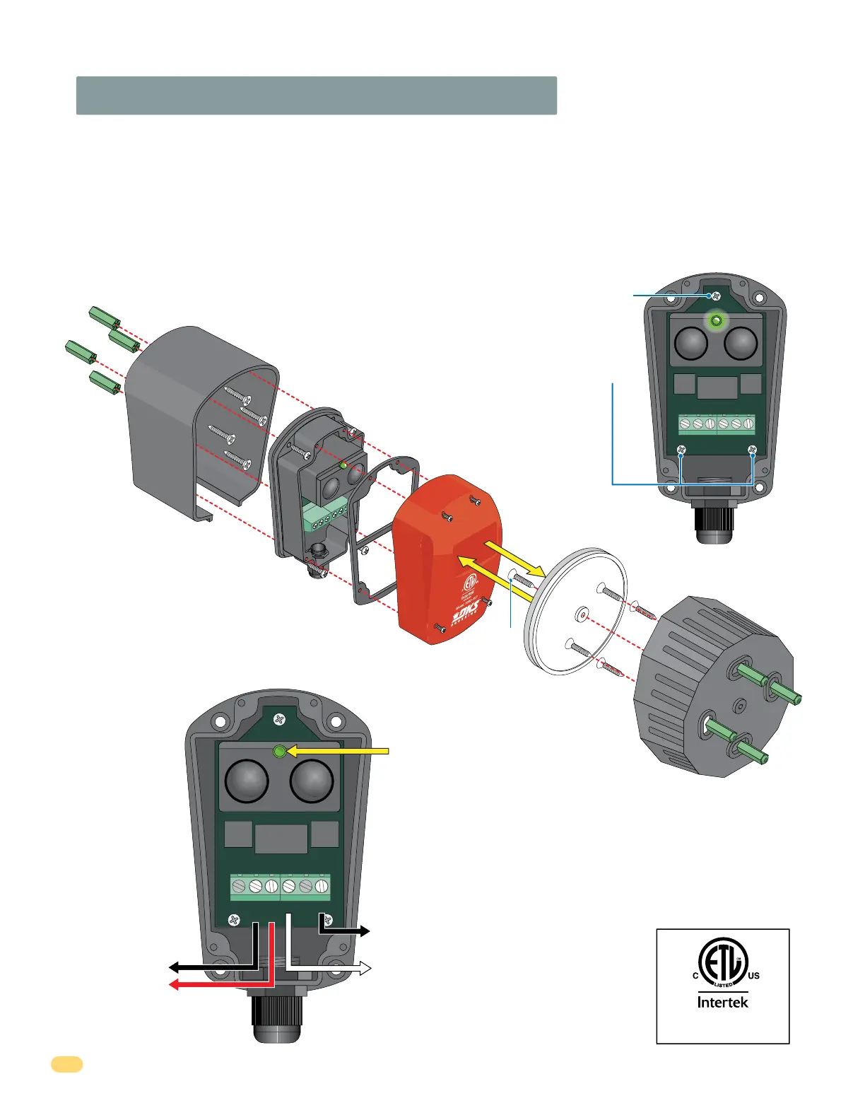 This retro-reflective photocell (UL 325 Type B-1) complies with the 2018 UL 325 standards. It must be wired to the control box using the